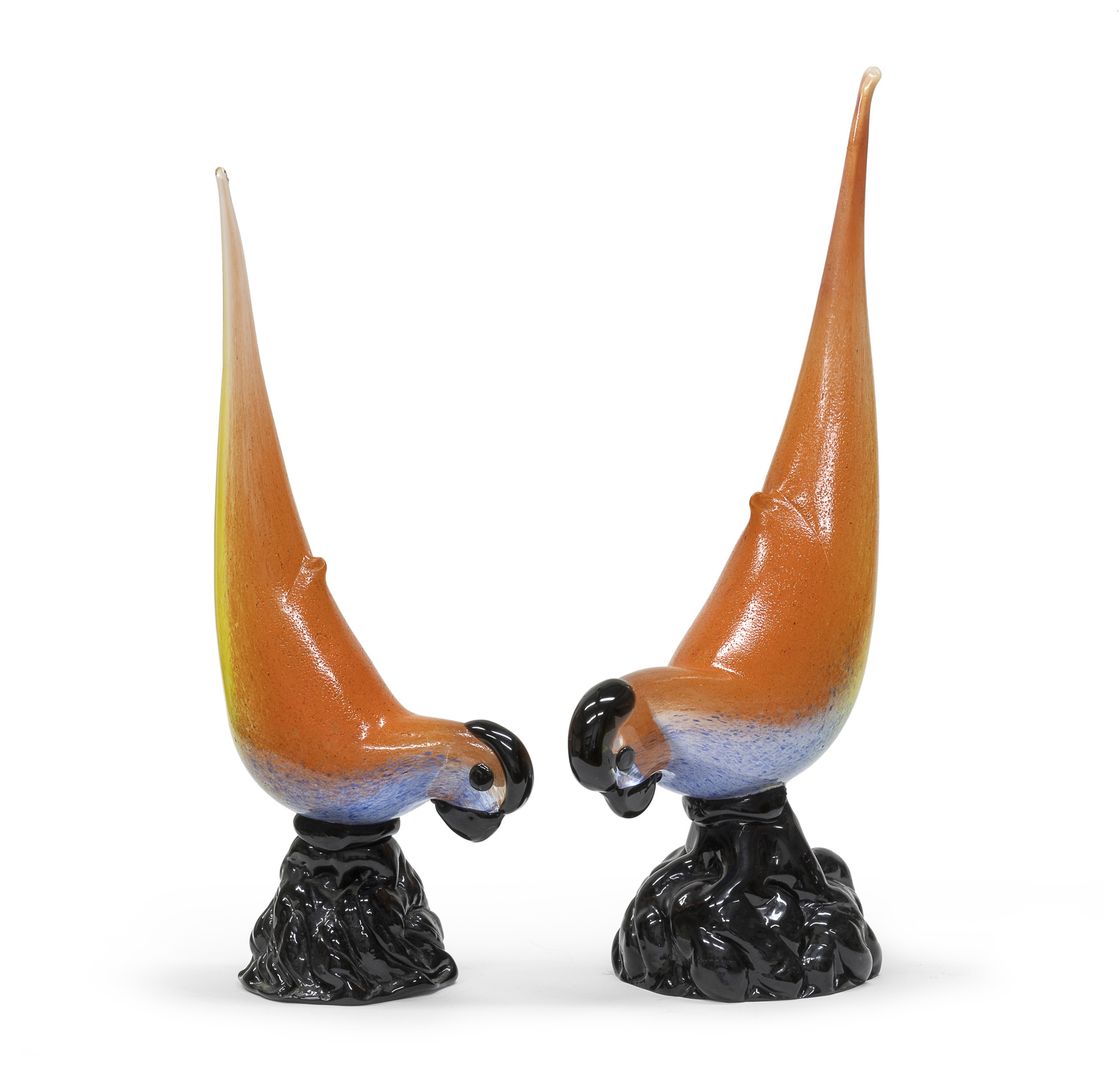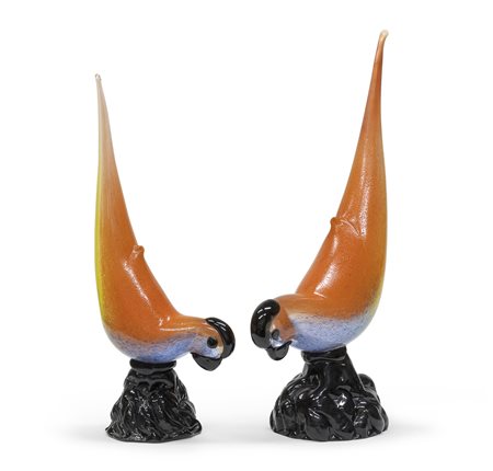 COPPIA DI SCULTURE DI PAPPAGALLI, MURANO ANNI '80