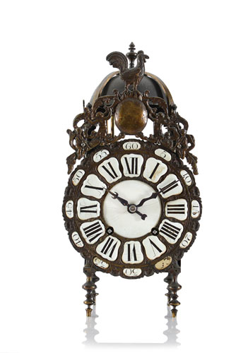 PENDOLA A LANTERNA, XVIII SECOLO, cassa in bronzo e ottone, quadrante a fregio traforato a sirene e gallo con doppia numerazione su cartouches in smalto, cimato da campana, scappamento ad ancora; usure, mancanze e da revisionare.