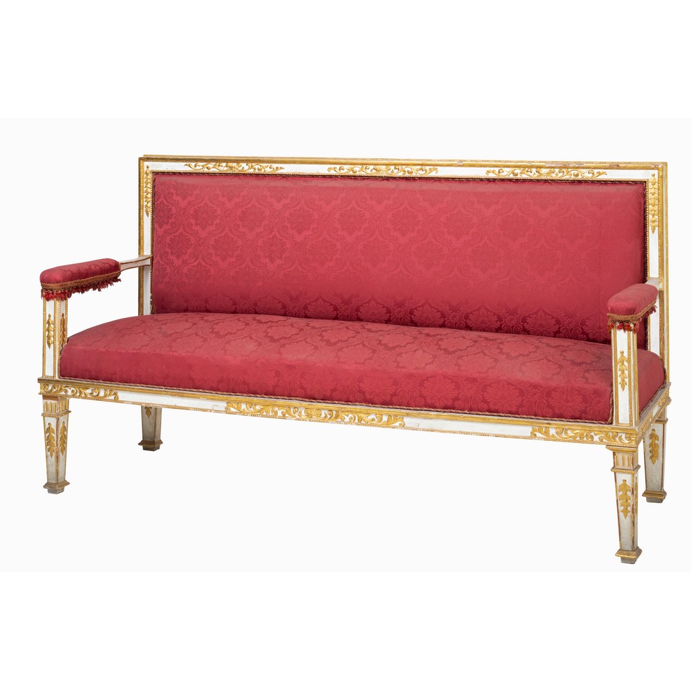 Divano Stile Luigi XVI in legno laccato e dorato ad oro zecchino.