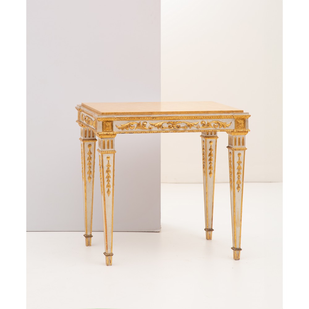 Tavolino da salotto Stile Luigi XVI in legno laccato e dorato ad oro zecchino, piano in marmo giallo di Siena.