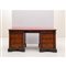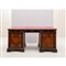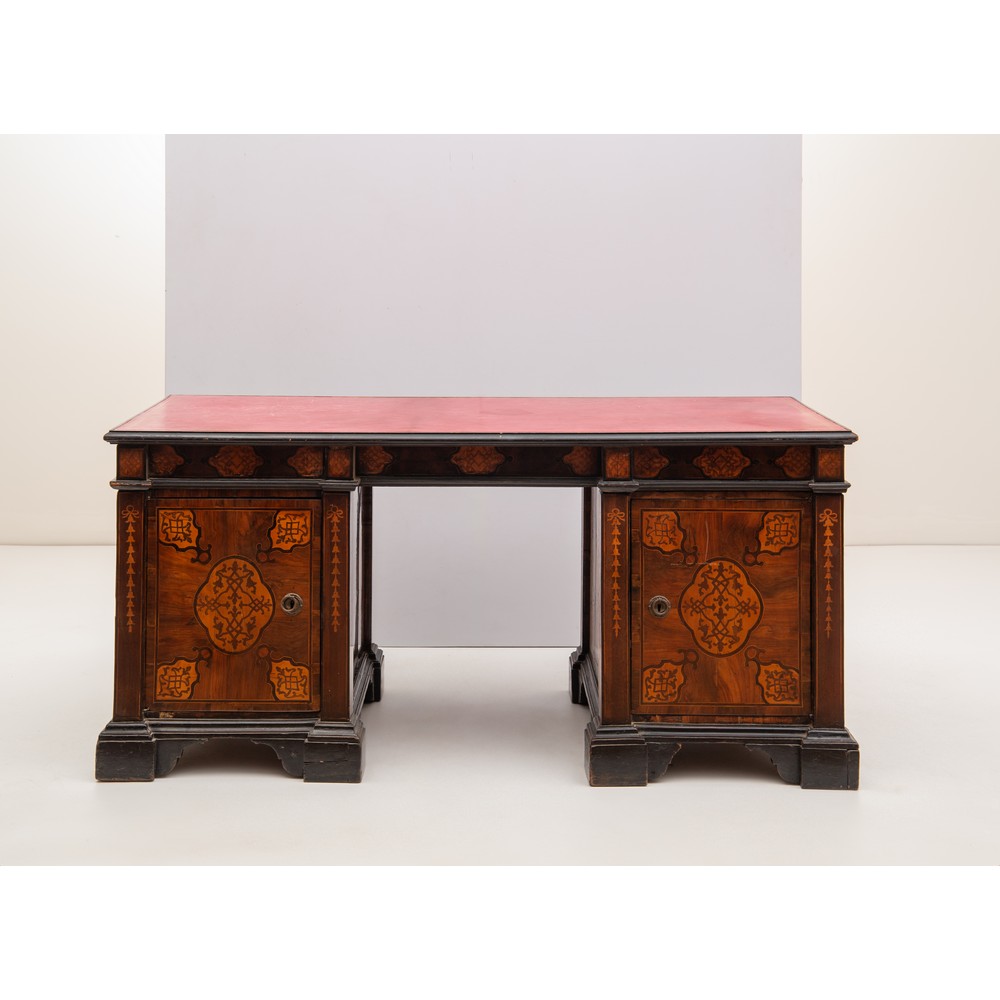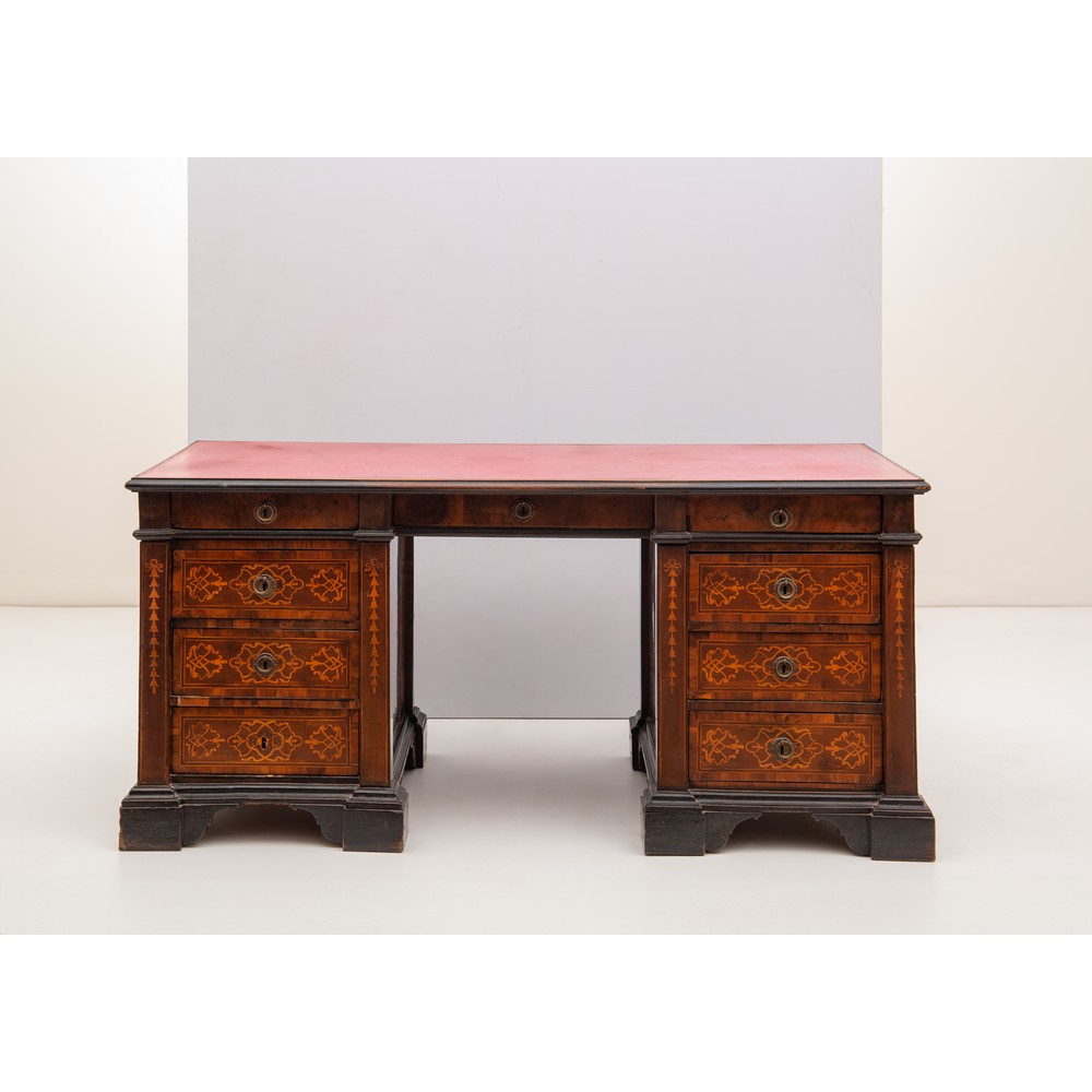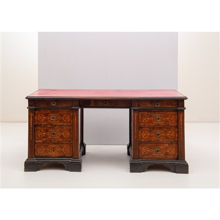 Scrivania da centro in legno e radica di ulivo con tarsie in bosso ed ebano violetto, composta da due piedi a colonna quadrangolare con anta e tre cassetti per ciascuna, piano superiore rivestito con pelle non coeva con tre cassetti.