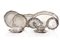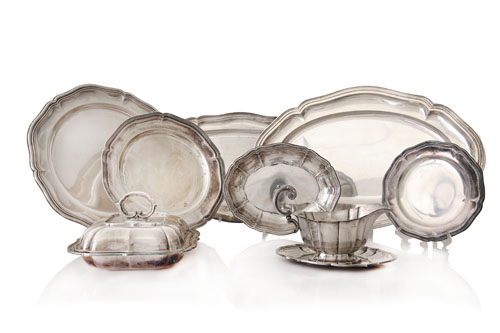 LOTTO DI DIVERSI OGGETTI IN ARGENTO, XX SECOLO, composto da una pesciera, due diversi piatti sagomati, una salsiera, una legumiera con coperchio; uniti a una pesciera, un piatto e una ciotola sagomata in metallo argentato, bordi centinati; difetti.
