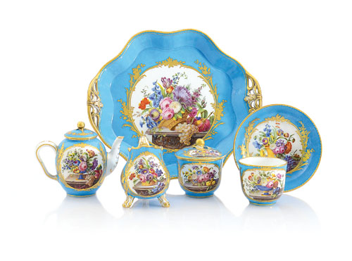 SEVRES SERVIZIO DA TE' SOLITAIRE IN PORCELLANA CON DECORO POLICROMO, XIX...