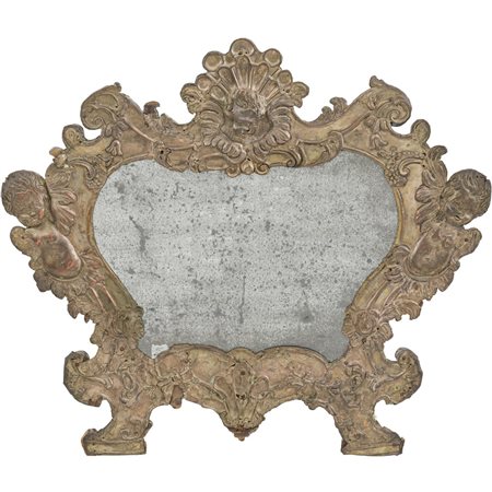 Carta gloria di epoca Luigi XIV con specchio in rame sbalzato con putti a rilievo.