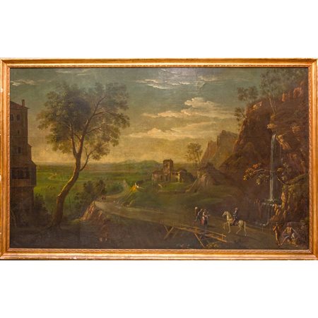 Paesaggio di campagna, probabilmente Italiano, con viandanti
