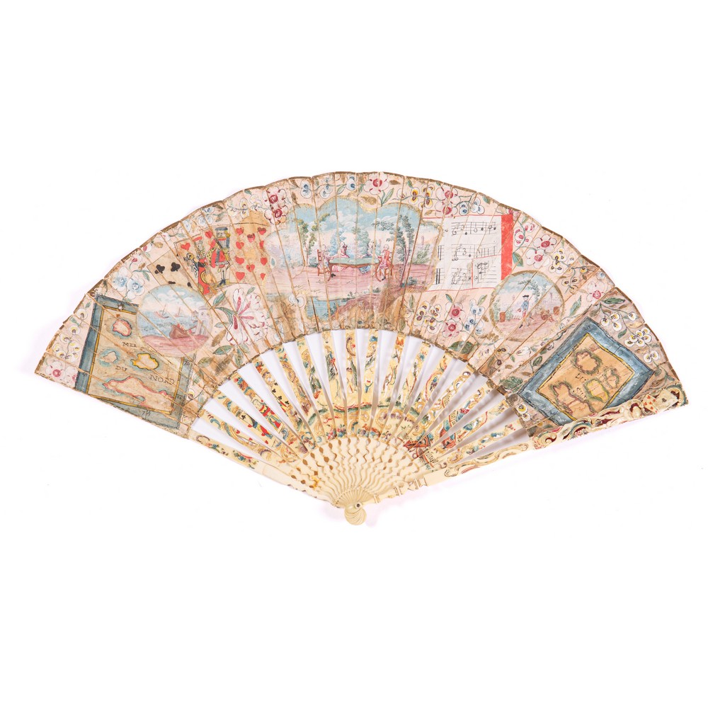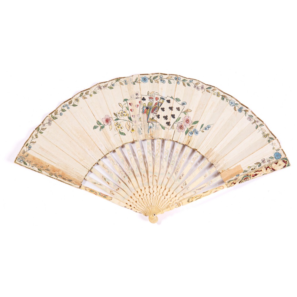 VENTAGLIO pieghevole con pagina frontale in carta litografata ed acquerellata con scene di gioco. Parte posteriore decorata con motivi floreali e ramagés dorati. Tredici stecche incise e dorate.