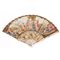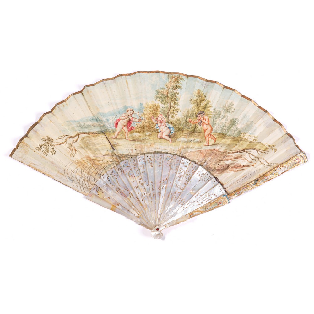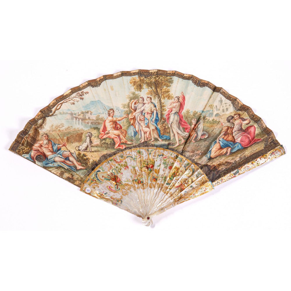 SPLENDIDO VENTAGLIO fornito di venti stecche in madreperla interamente incise, traforate e lumeggiate, intagliate e dipinte. Intaglio con teoria di putti, attorniati da caprette, insetti dipinti con motivi floreali e musicali. Pagina in pelle di pollo double-face, sulla frontale la rappresentazione del “Il giudizio di Paride”, insieme ad Era, Atena ed Afrodite. Nel lato sinistro il vecchio Priamo, nel lato destro due figure femminili in paesaggio italiano. A destra targhetta con la firma Grue Fecit 1722 (Carlo Antonio Grue ).