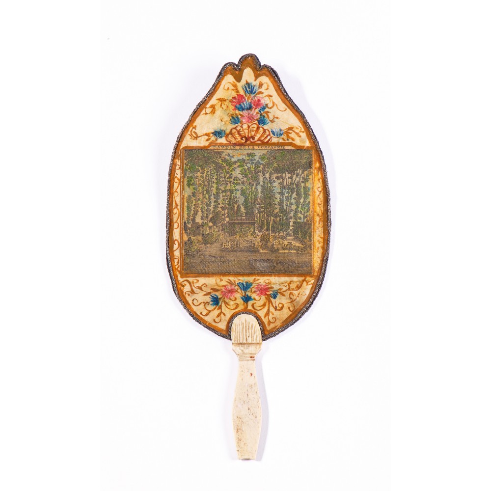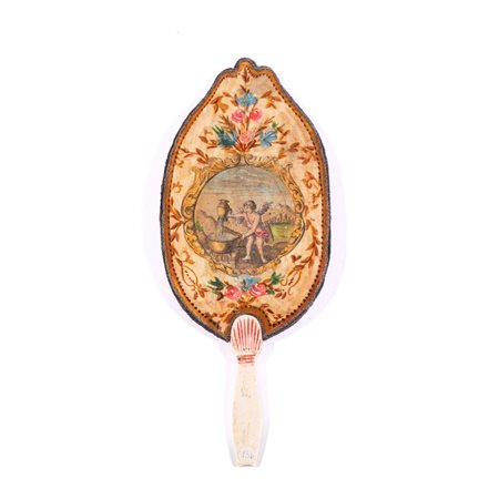 VENTOLA per fanciulla, pagina con pergamena orlata da filo di argento e dipinta a motivi floreali, applicazioni di incisioni. Sul fronte un amorino che prepara un elisir di amore, sul retro un Jardin della Lompagnie & Quot. Il manico è leggermente inciso.