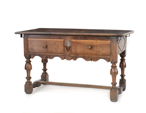 TAVOLO IN NOCE, XVIII SECOLO, piano rettangolare con due cassetti alla fascia, sostegni torniti a rocchetto con traverse di raccordo; sostituzioni, difetti e usure.
