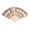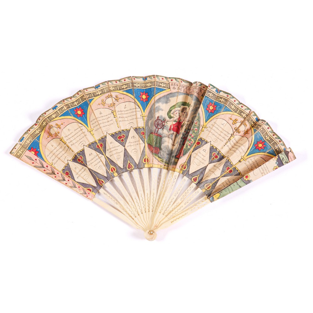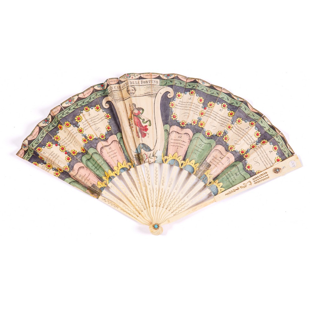 VENTAGLIO per gioco galante, con pagina in carta pergamena litografata ed acquerellata in policromia. Sedici stecche traforate. Una stecca di guardia mancante. La stecca frontale contiene un meccanismo a ruota che fornisce i numeri tipo roulette. Tali numeri corrispondono nelle pagine a sedici domande e sedici risposte, elencate in medaglioni a lunette a mo’di petali di margherita. Nella pagina frontale, un piccolo puttino, simbolo della fortuna pone le domande e gira la ruota della fortuna, sotto l’insegna “Les jeux de l' amour e de la fortune”. Nel retro la Dea fortuna con cornucopia da