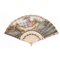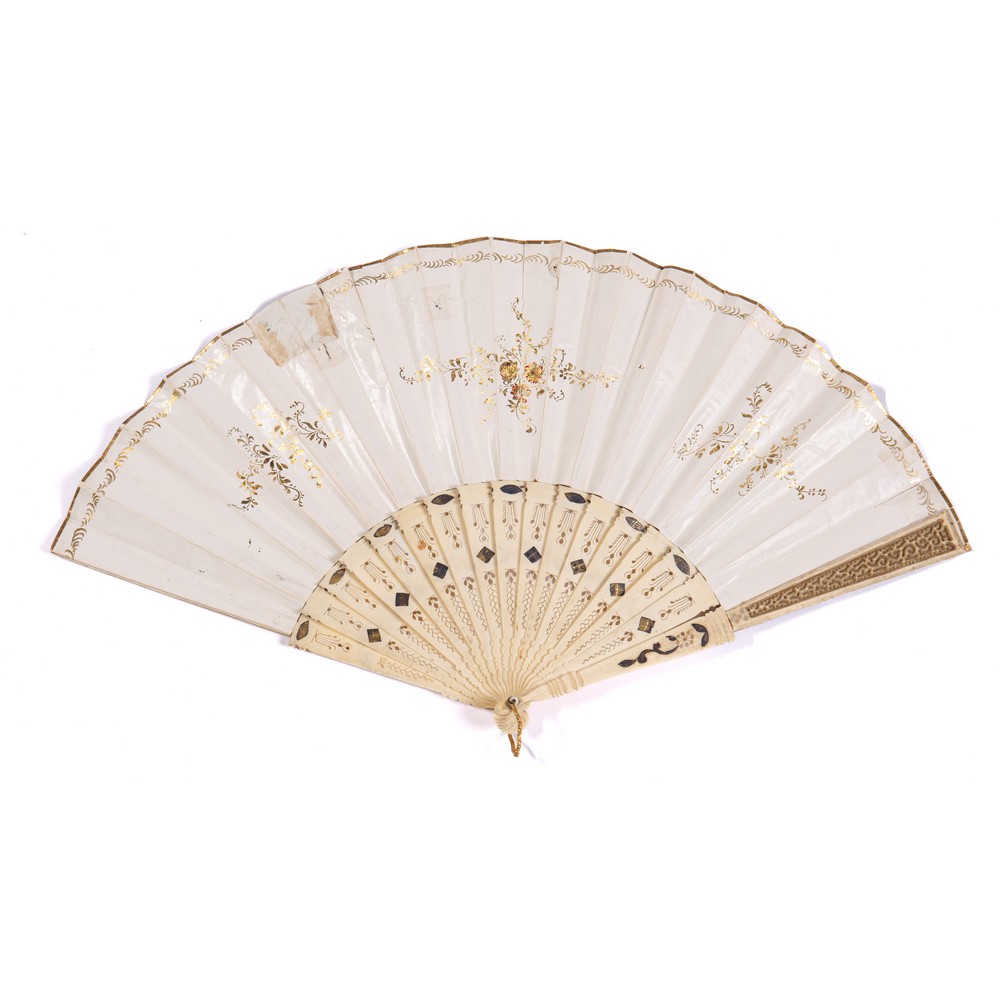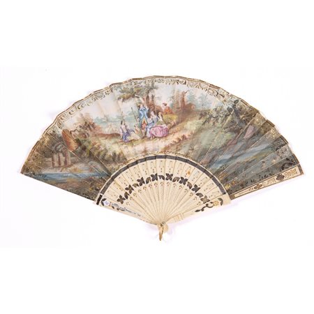 VENTAGLIO fornito di diciassette stecche in incise, traforate e lumeggiate. La pagine in carta dipinta in policromia, rappresenta scena galante in arcadia, nella parte posteriore semplici decorazioni in oro.