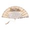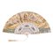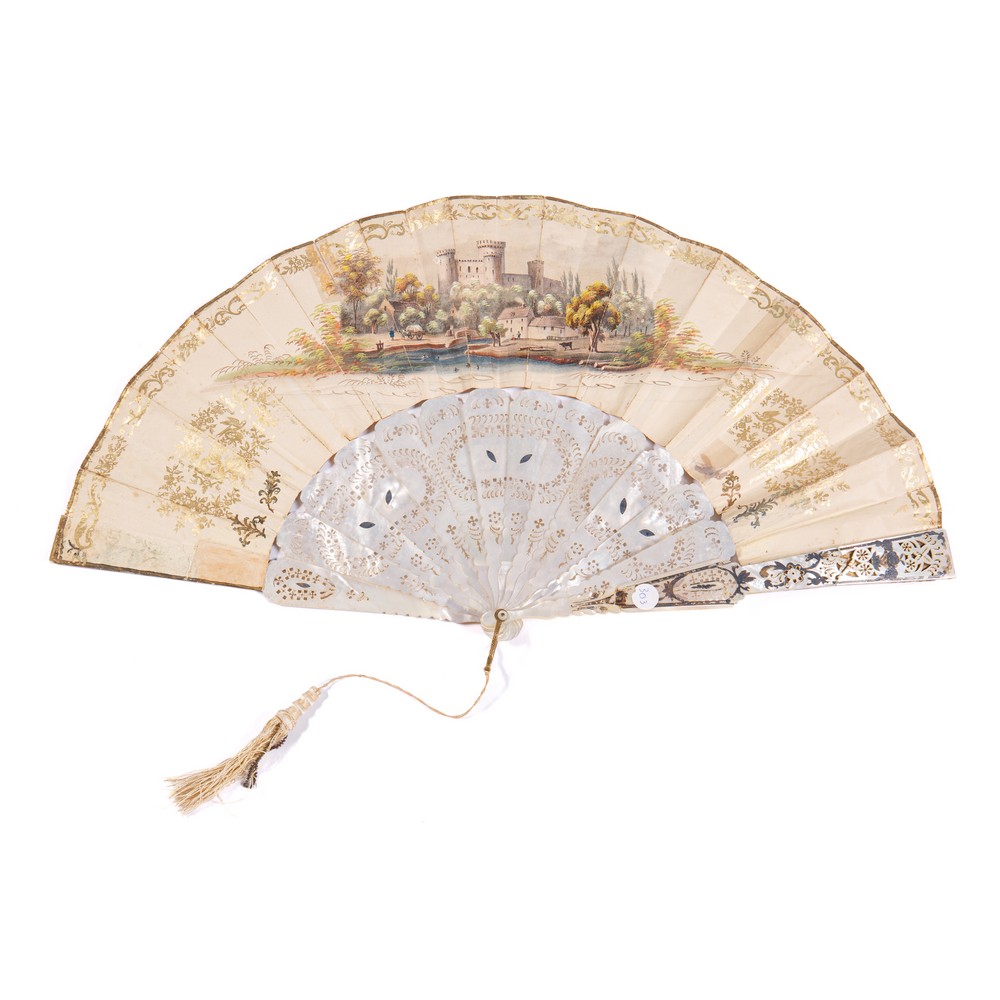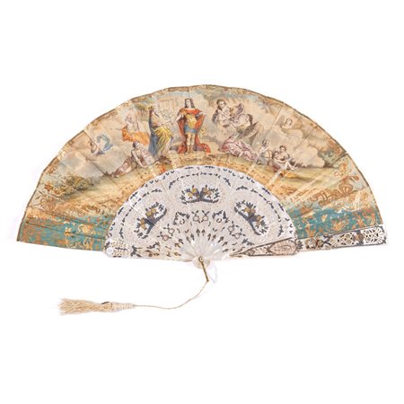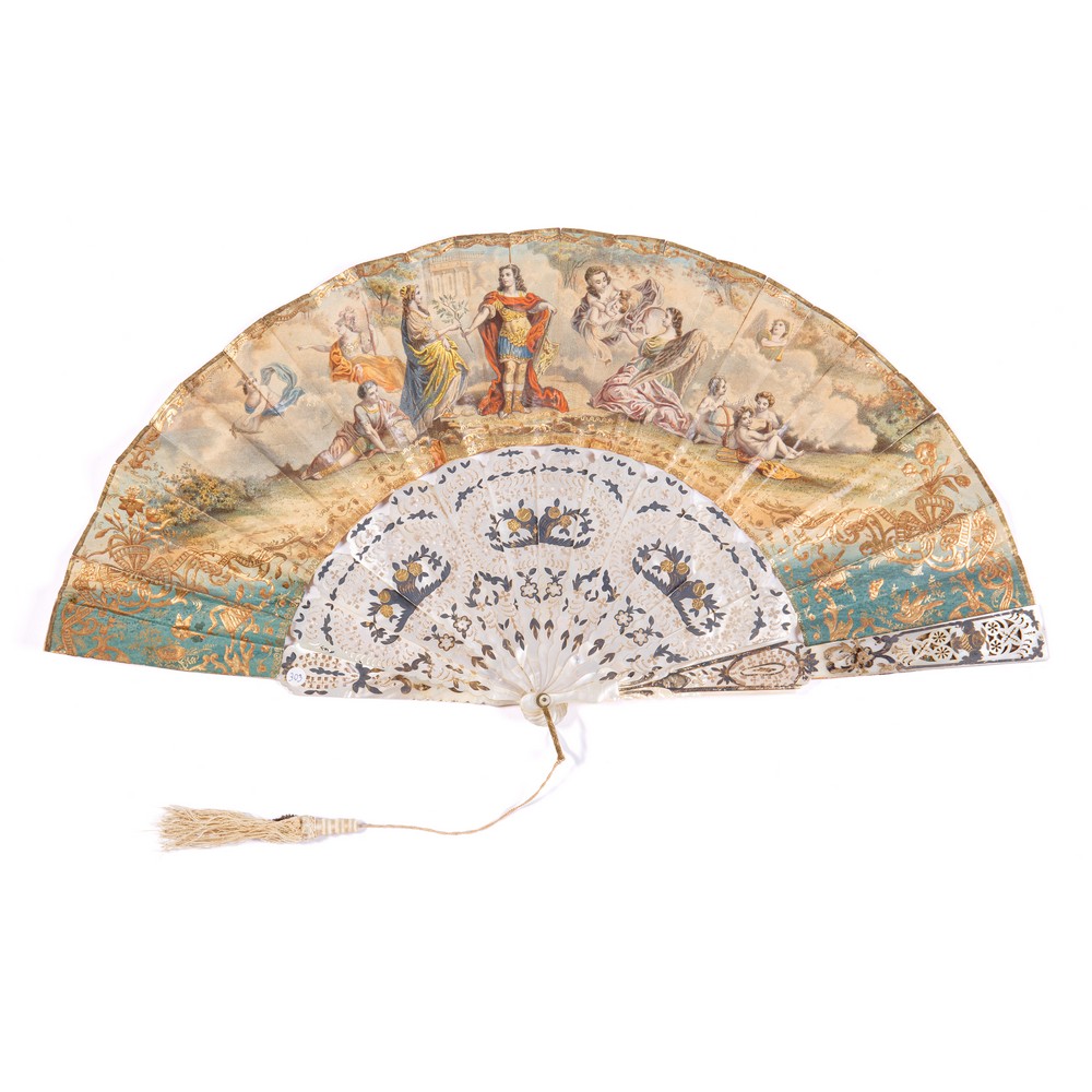 VENTAGLIO da ballo, fornito di quattordici stecche in madreperla finemente intagliata e traforata a motivi floreali. Pagina in carta litografata e acquerellata con scene double-face; nella scena frontale un guerriero porge un ramo d' ulivo alle Regina, in secondo piano le figure di Mercurio, la guerra, la maternità, l'angelo e i puttini che giocano con i simboli delle arti. Nella scena posteriore veduta di un castello e paesaggio.