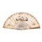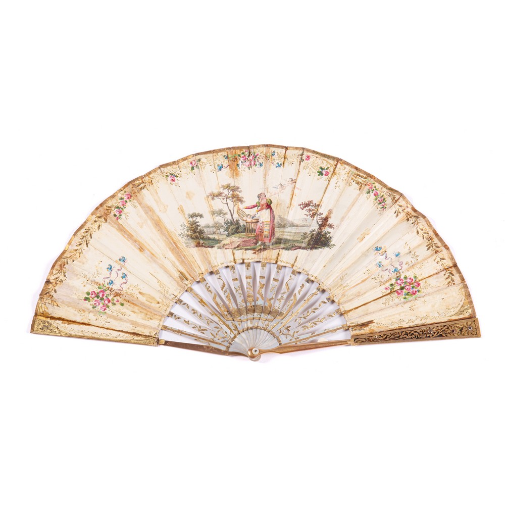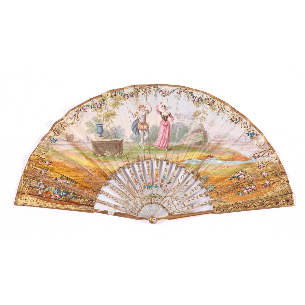 VENTAGLIO da sera in pelle di pollo con pagina doppia incisa ed acquerellata con scene galanti, paesaggi e motivi floreali su fondo oro. Sedici stecche in madreperla incise e dipinte con festoni e fiori. Stecche di guardia in oro sbalzato e traforato a motivi floreali: nelle corolle piccoli rubini.