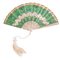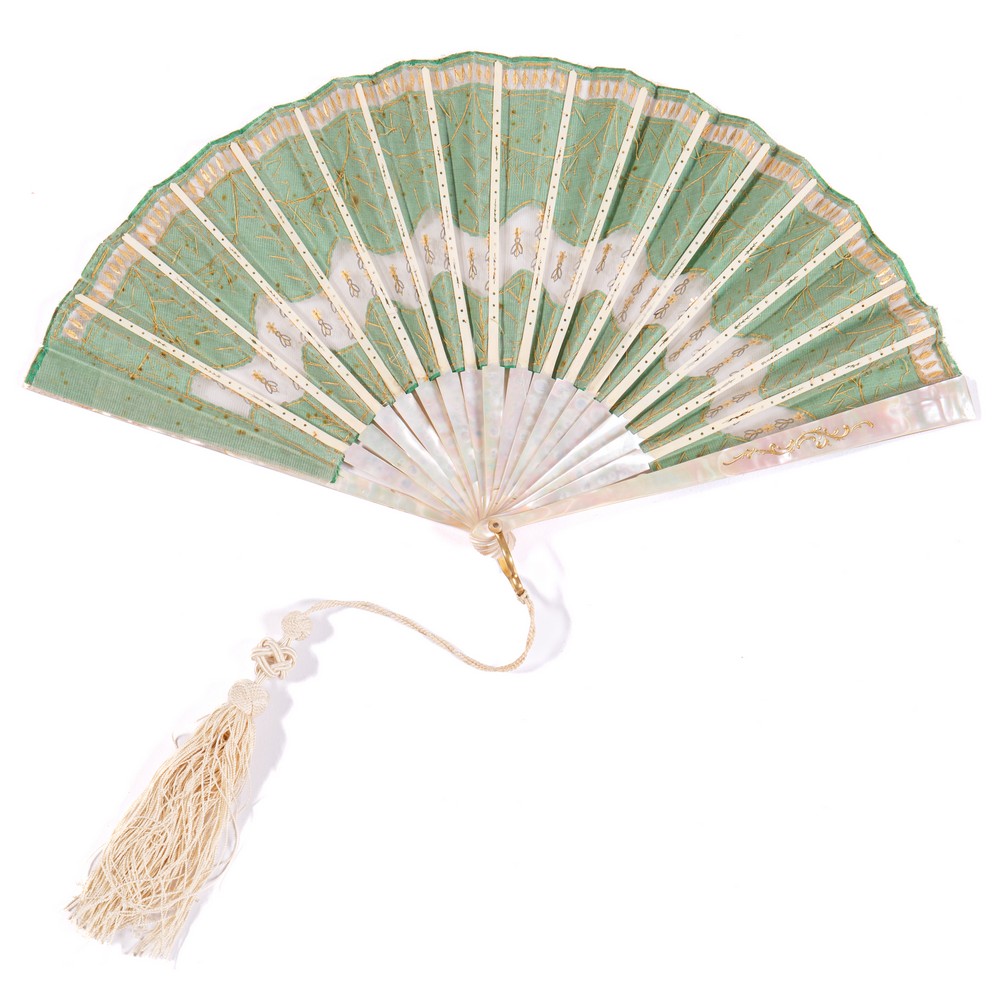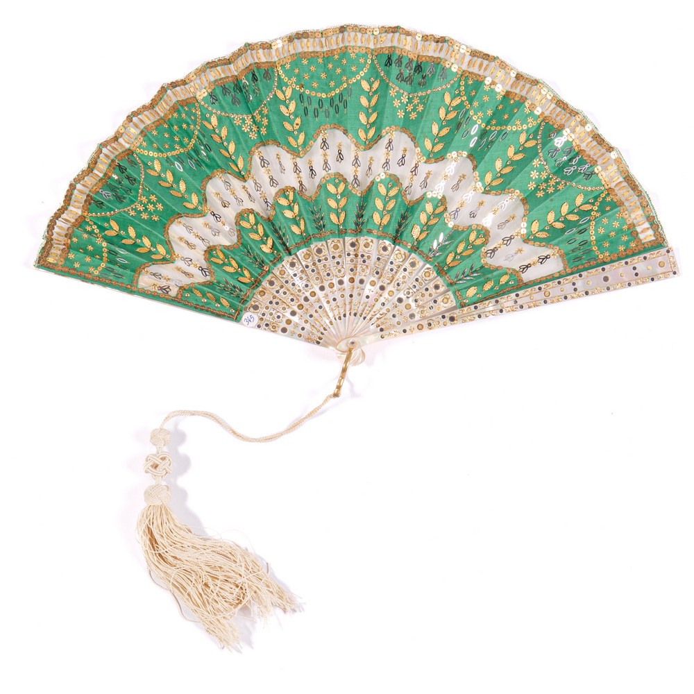 VENTAGLIO da sera, fornito da diciotto stecche in madreperla massiccia, incisa, intarsiata con lustrini in oro, argento e lumeggiata in oro. Pagina in organza e seta color verde chiaro interamente decorata nei toni di colore oro e argento con motivi floreali e festoni ottenuti dagli inserti di teorie di applicazioni di paillettes dorate, lustrini dorati e argentati. Nappina in cordoncino di seta colore avorio.