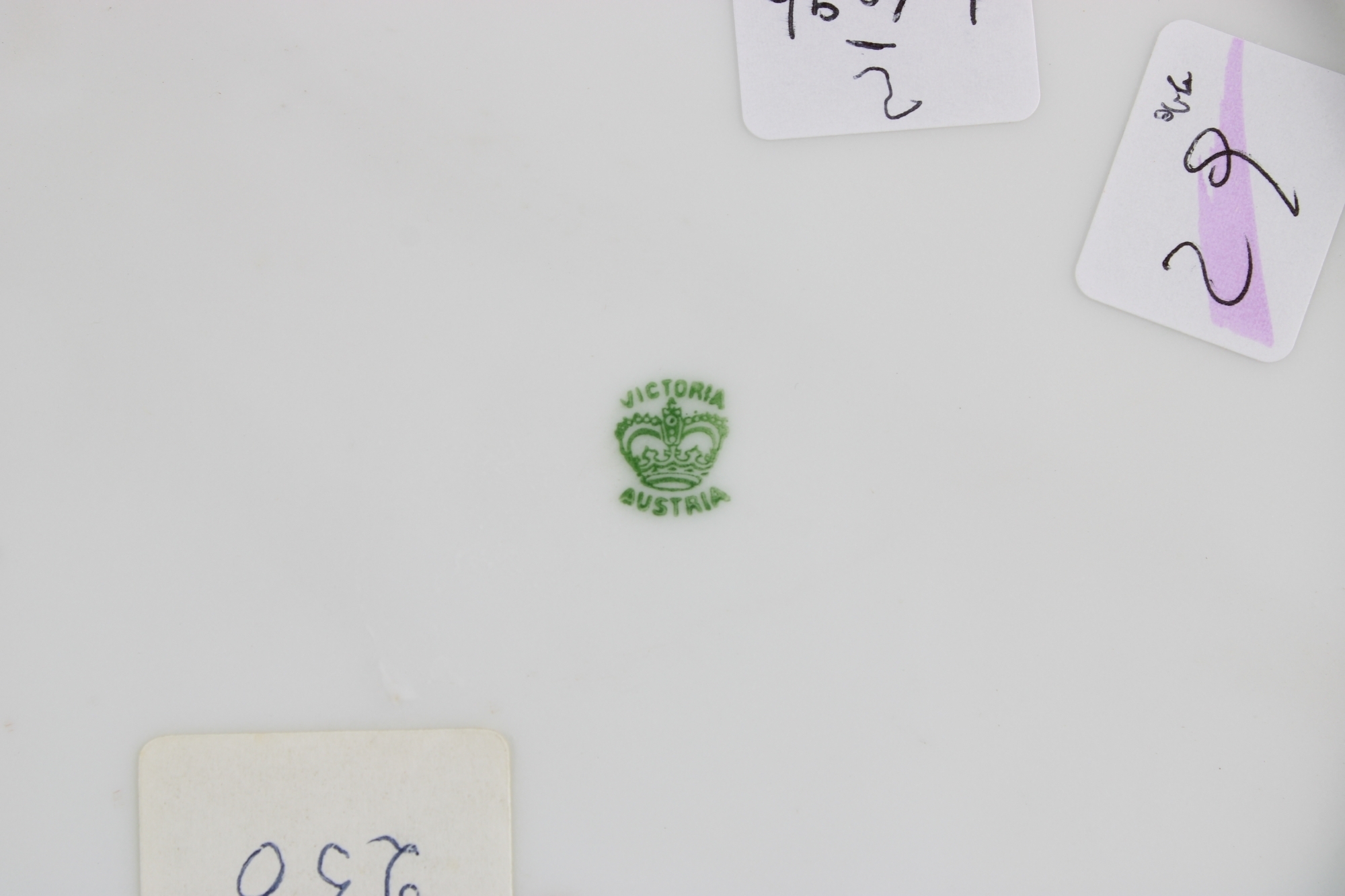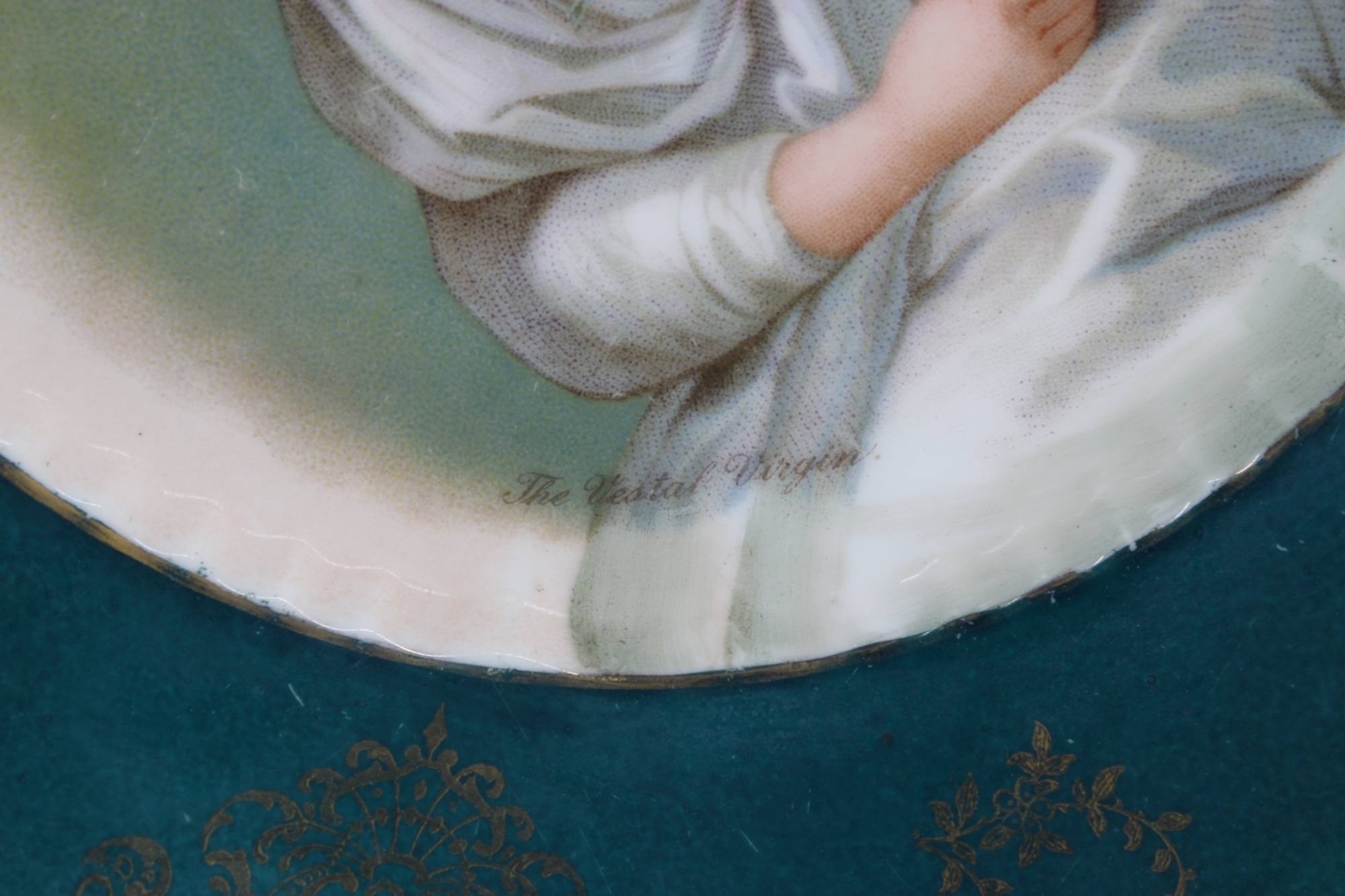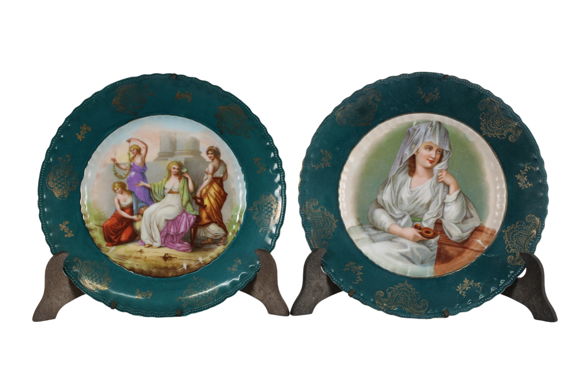2 PIATTI in porcellana marcati Austria, decorati da figure femminili e tesa verde e dorata vintage cm 25 Ø