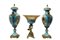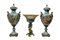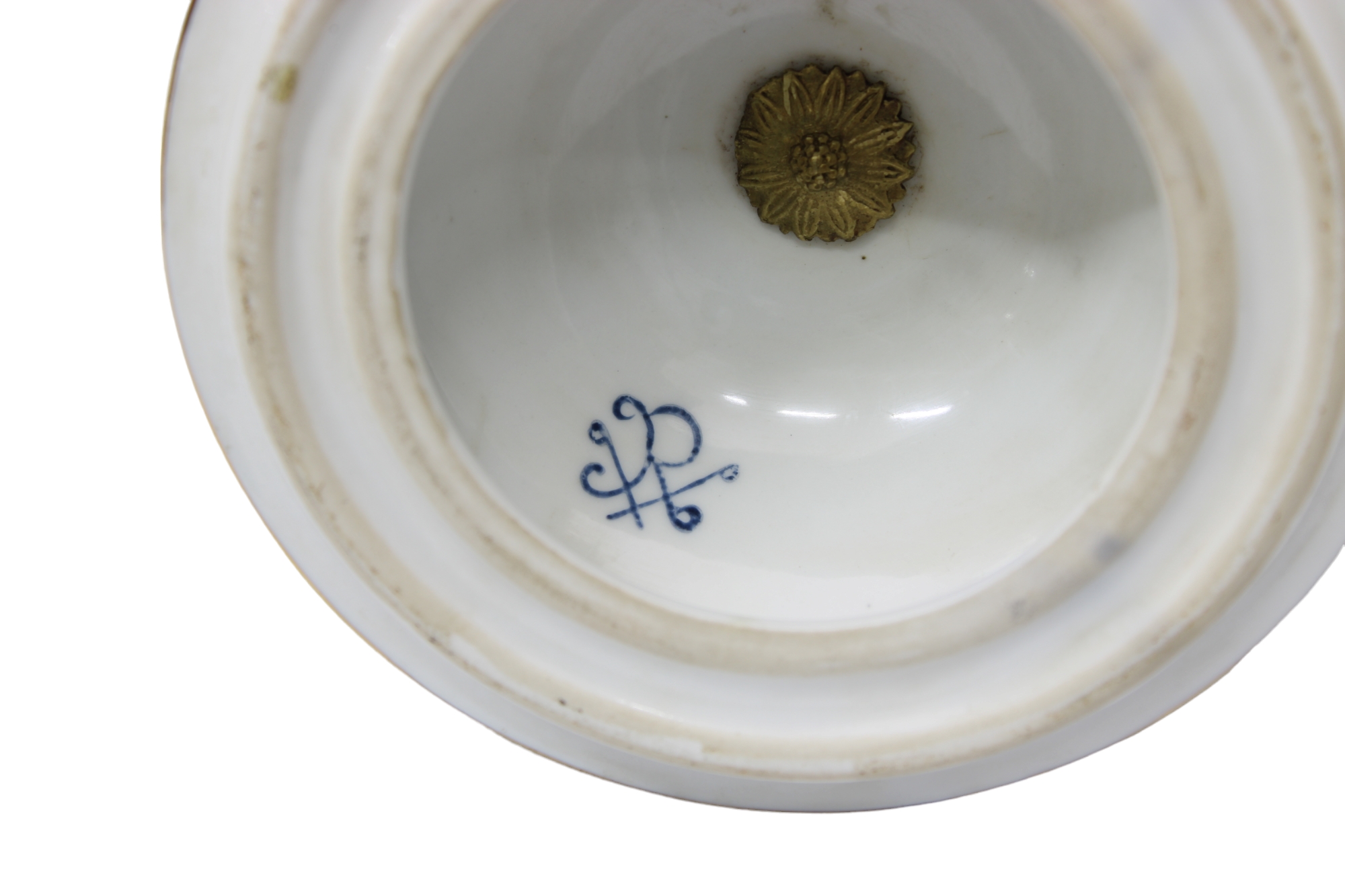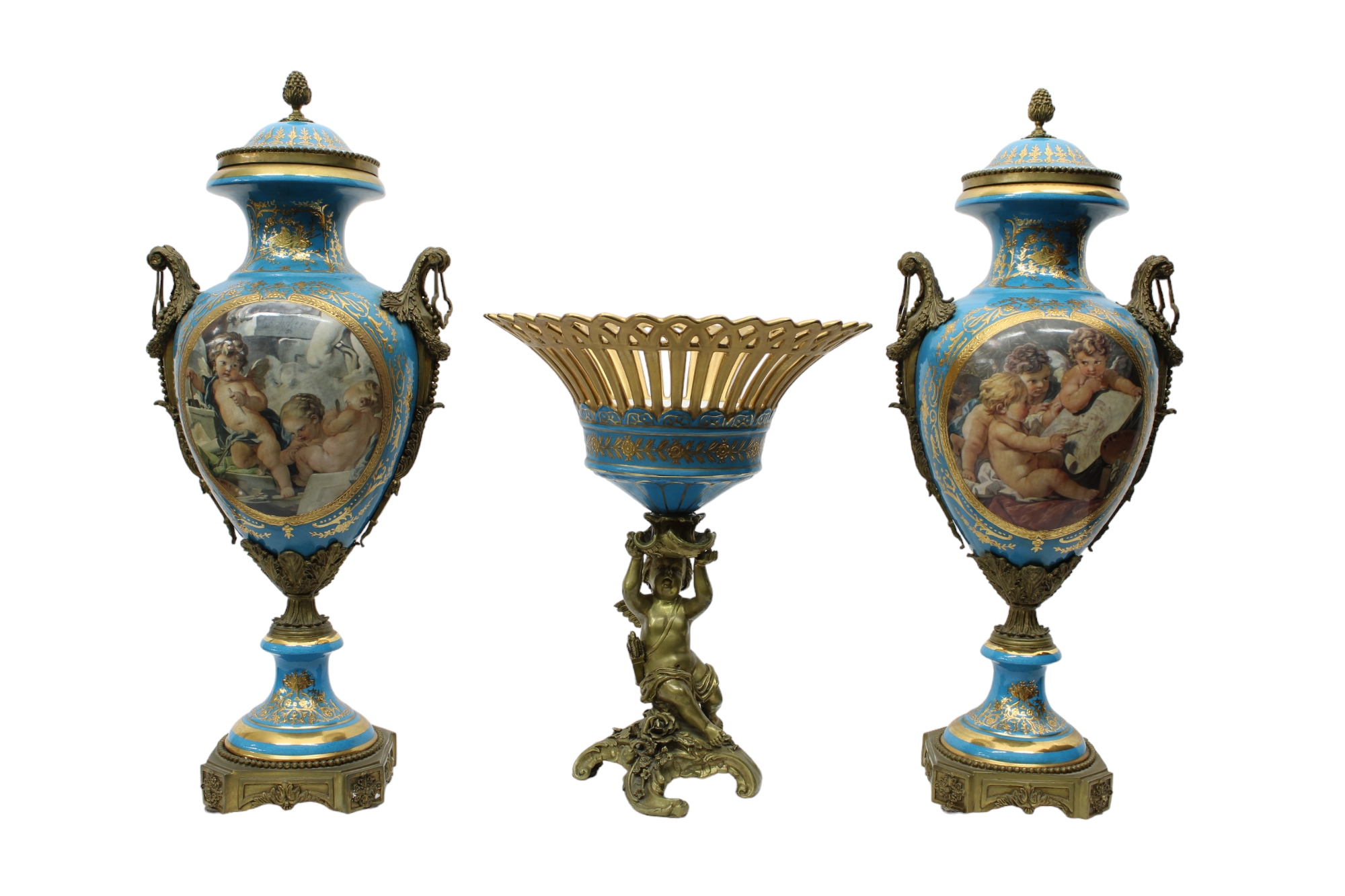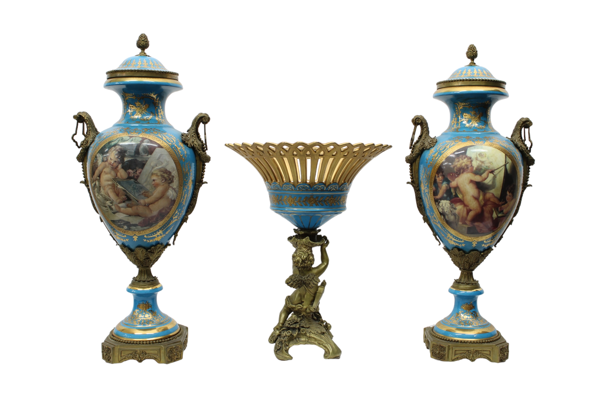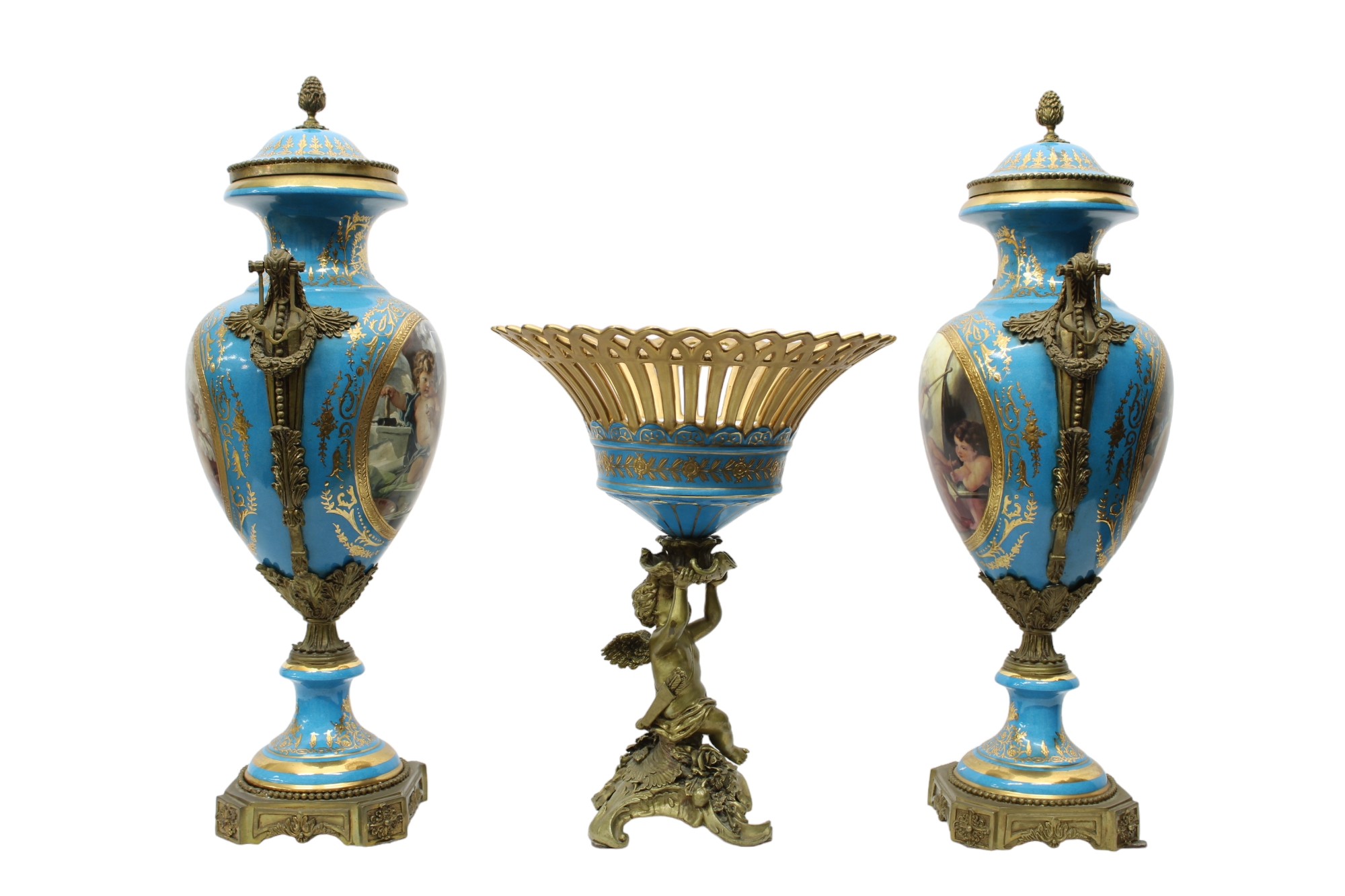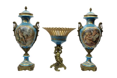 TRITTICO in porcellana composto da: coppia potiche e alzata sostenuta da putto in bronzo Francia primi metà del XX secolo h cm 61 x 28 x 20 / h cm 41 x 32