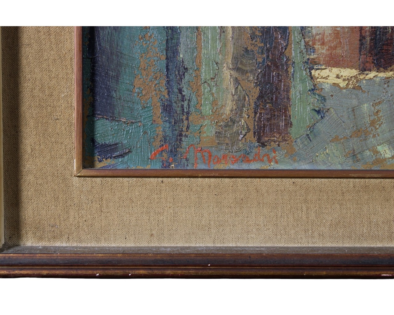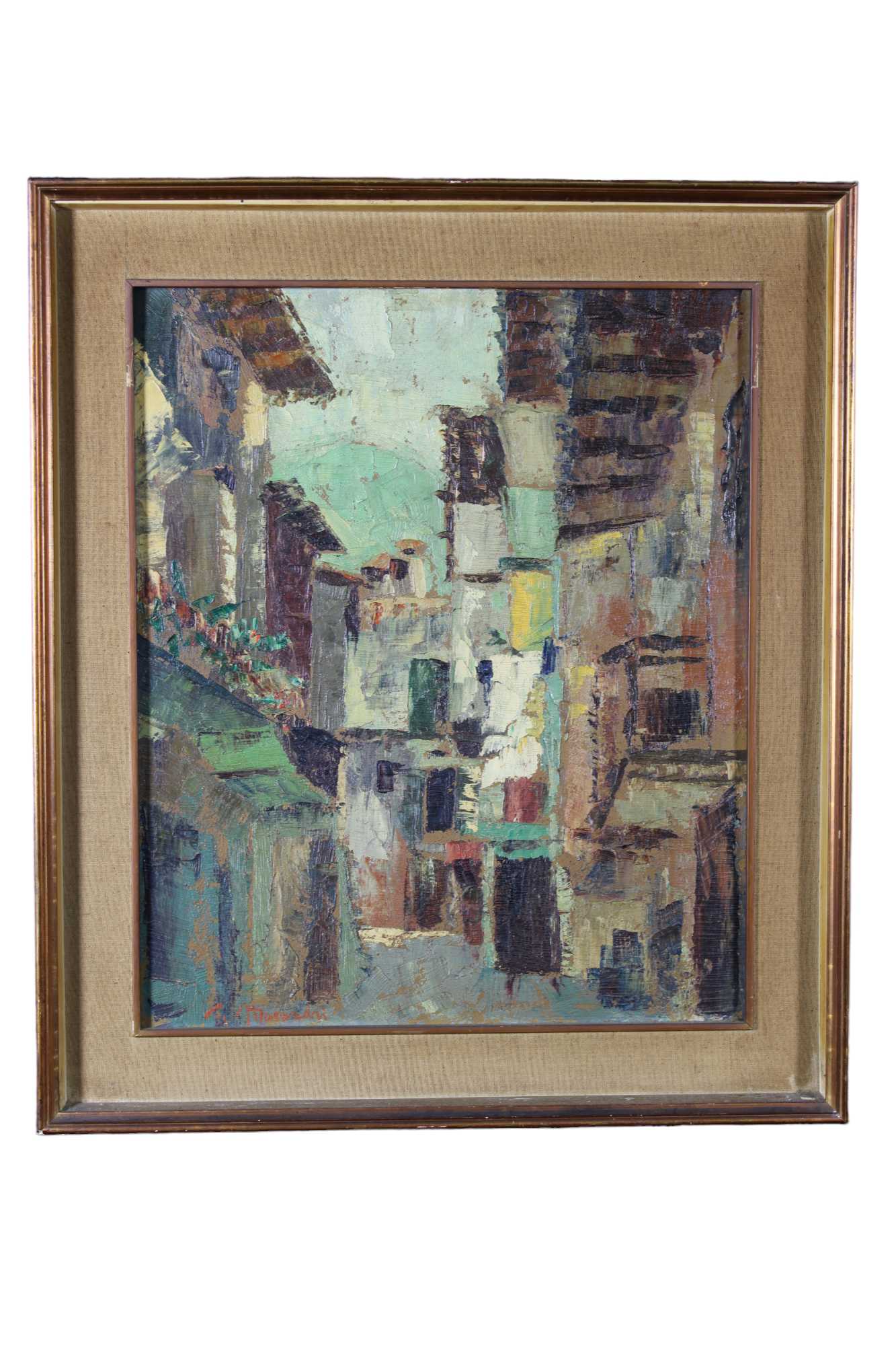 OLIO SU CARTONCINO raffigurante scorcio di strada con caseggiato Italia XX secolo h cm 65 x 54 / cornice h cm 74 x 64