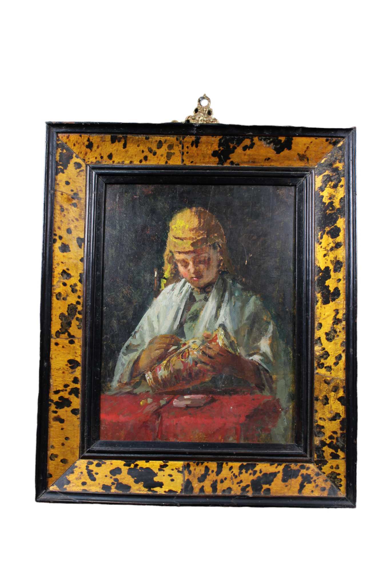 DIPINTO OLIO SU TAVOLA raffigurante giovane restauratore di porcellane, cornice in materiale pregiato h cm 33 x 24 / cornice h cm 47 x 39