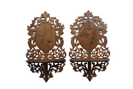 COPPIA DI MENSOLINE SORRENTINE in legno traforato e intarsiato Napoli primi 900 h cm 43 x 23 x 15
