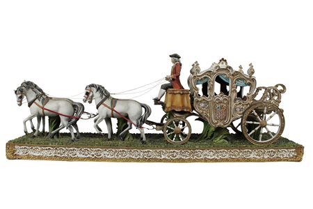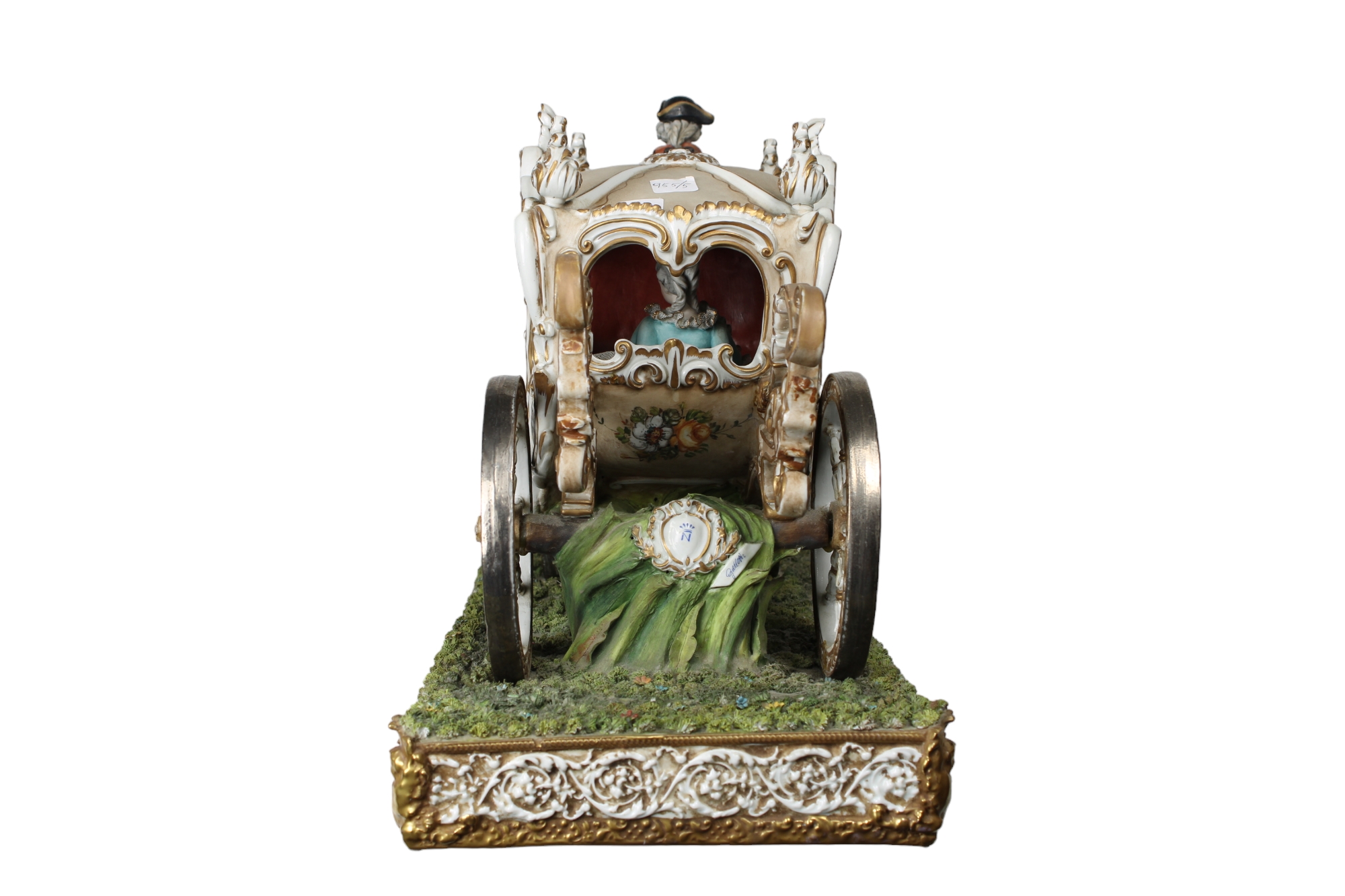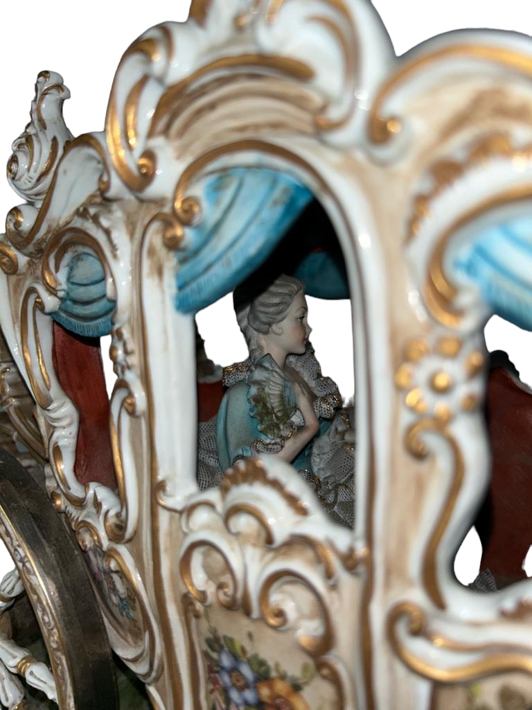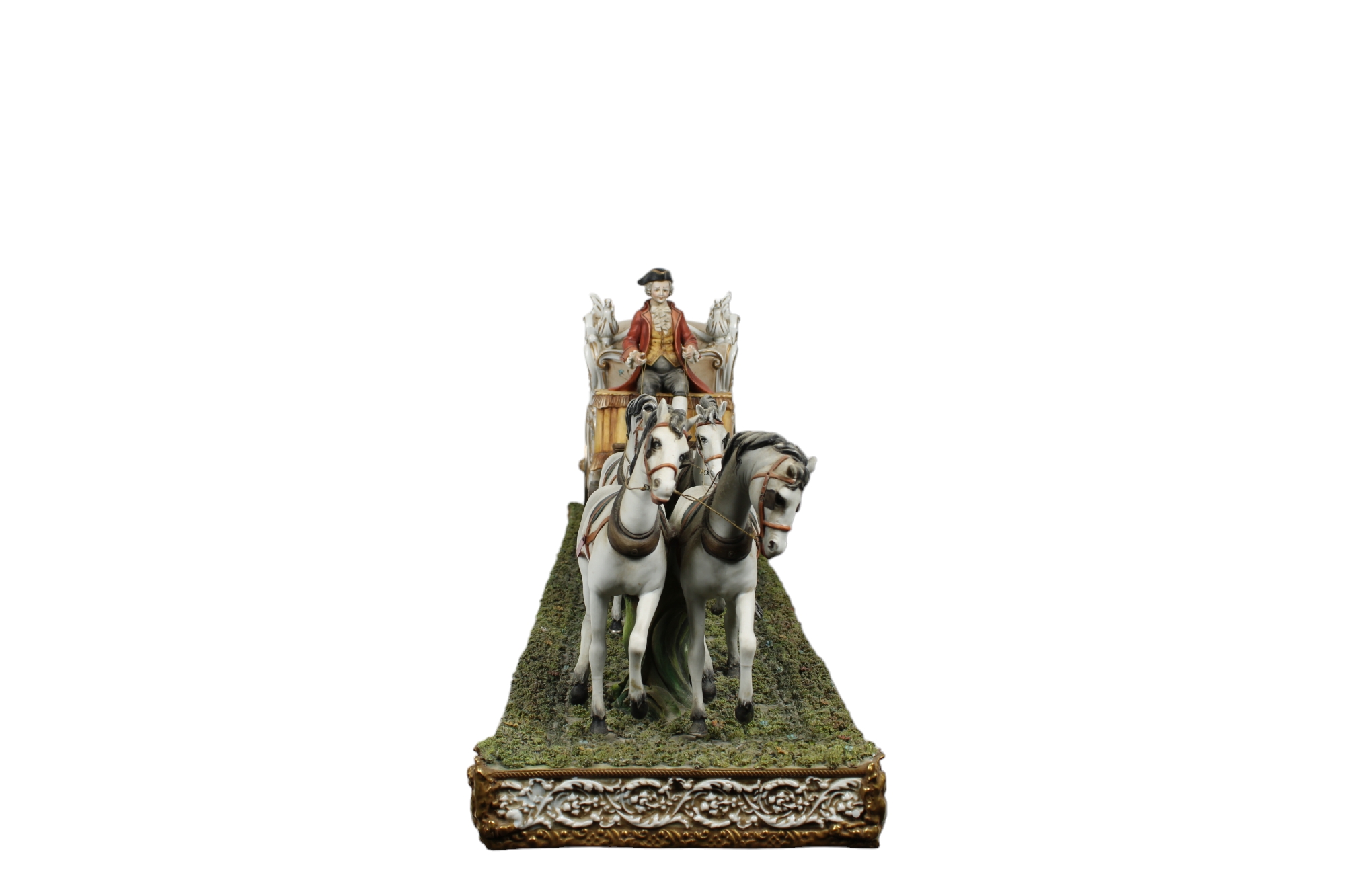 SCULTURA in porcellana raffigurante carrozza settecentesca tirata da quadrida di cavalli XX secolo h cm 35 x 93 x 23