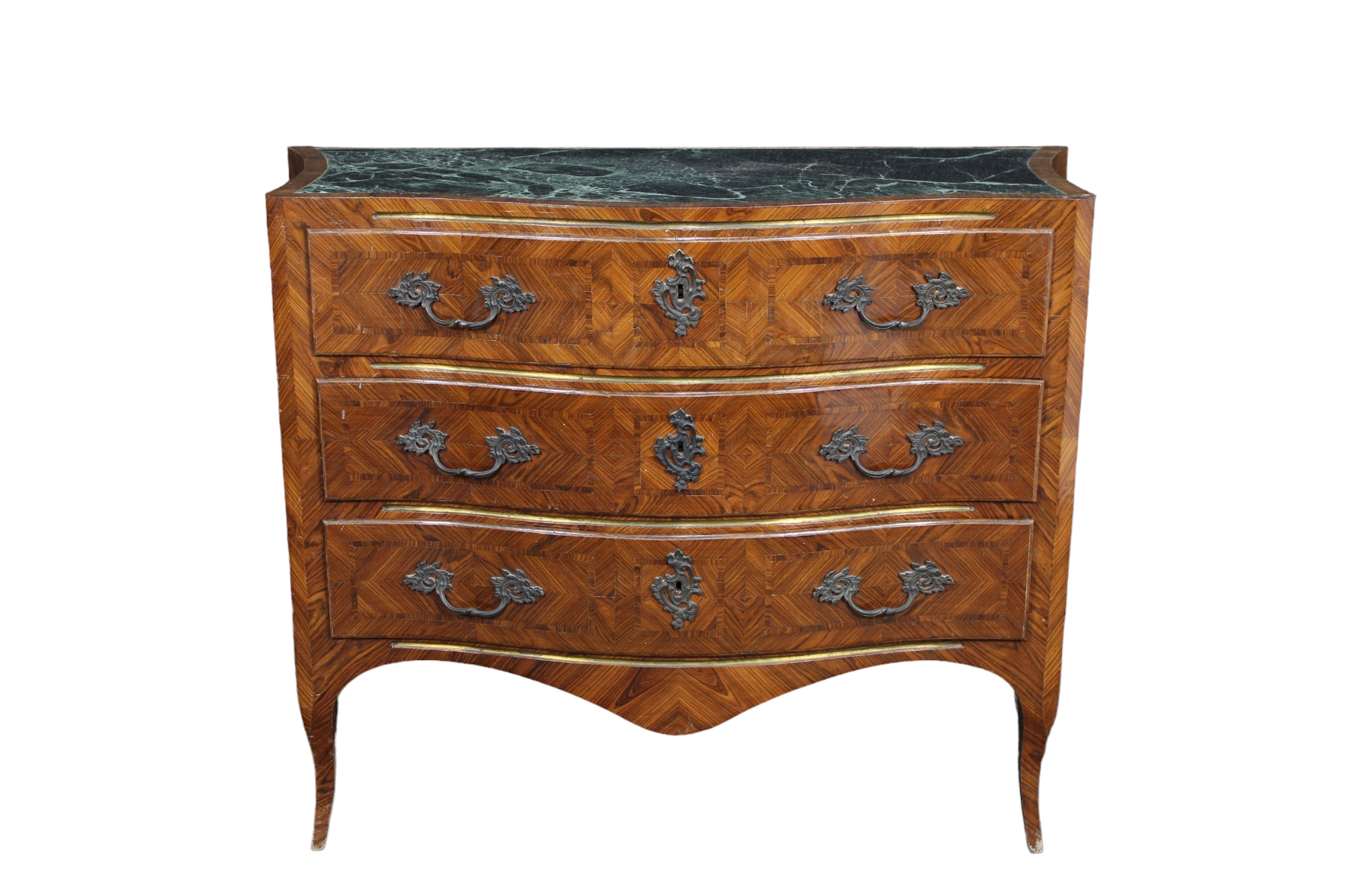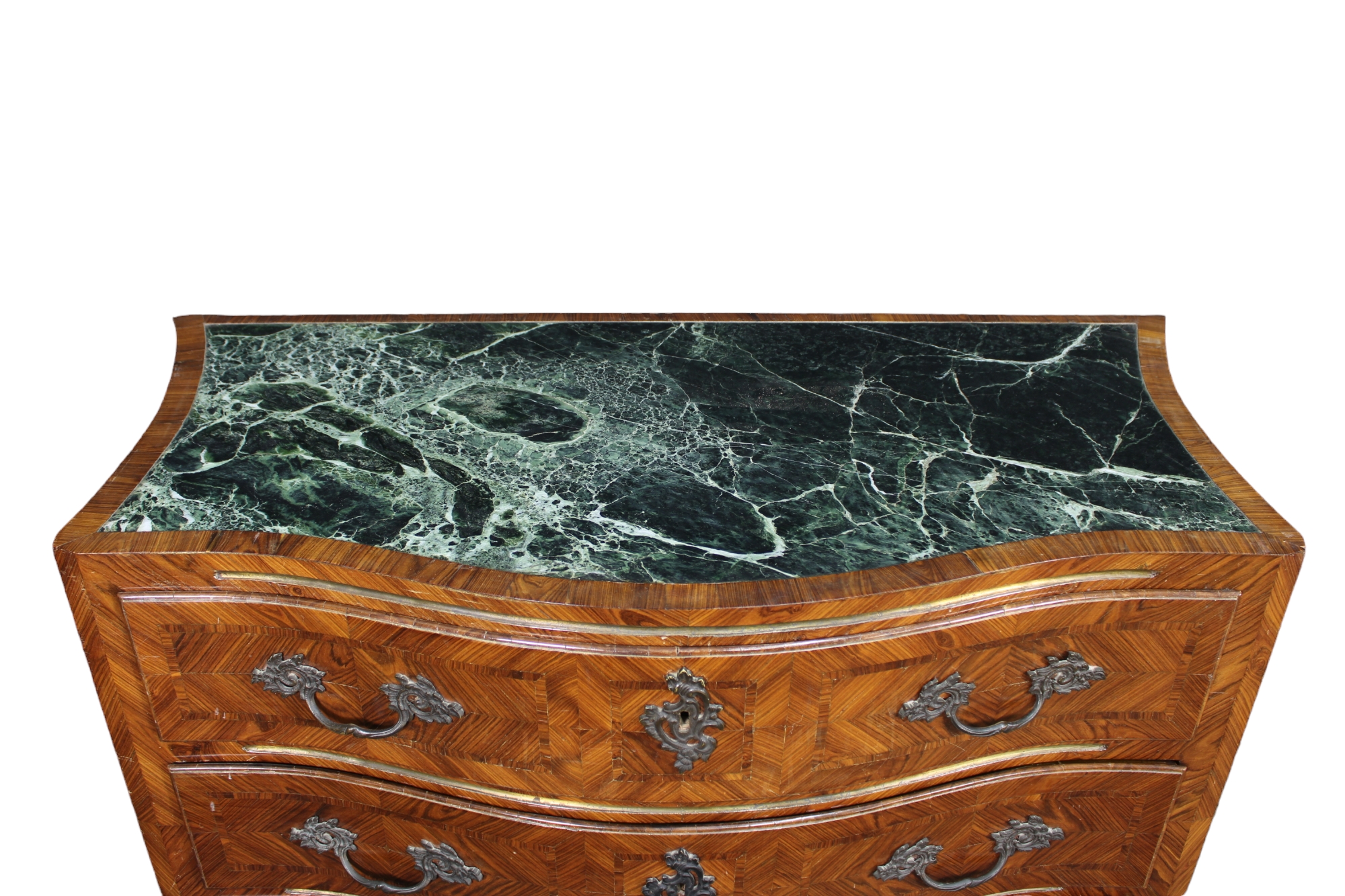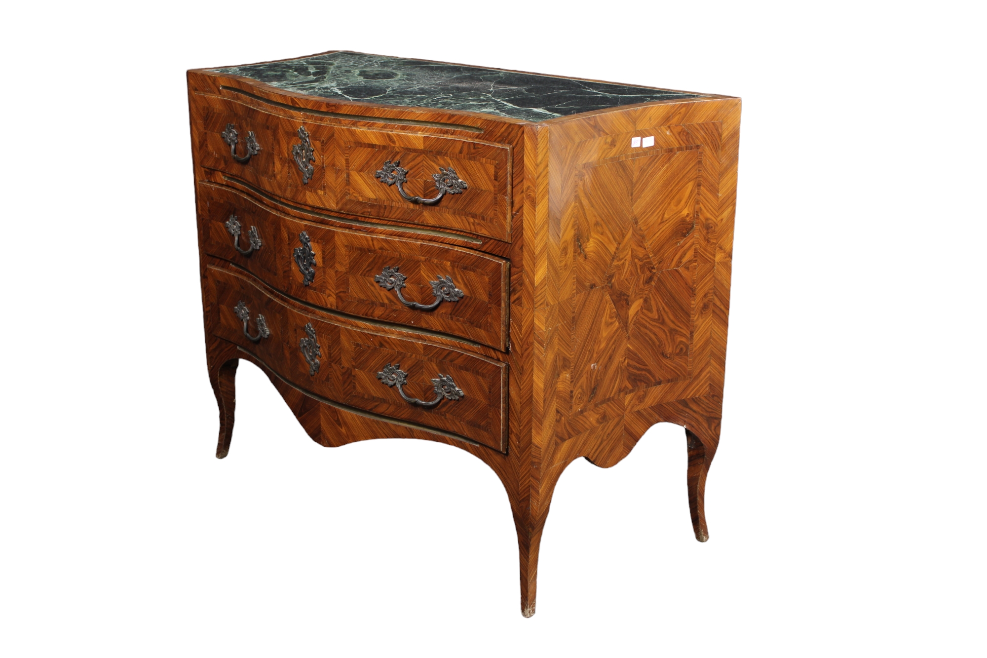CASSETTONE IN STILE LUIGI XV in ebano violetto, maniglie e borchie in bronzo e carta di Spagna, piano incassato in verde delle Alpi maestranze siciliane XIX/XX secolo h cm 93 x 120 x 60