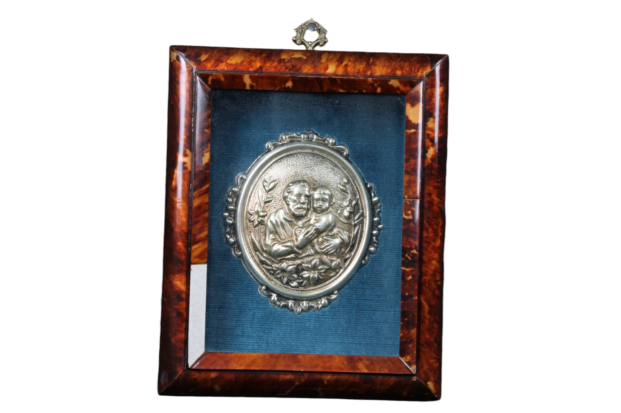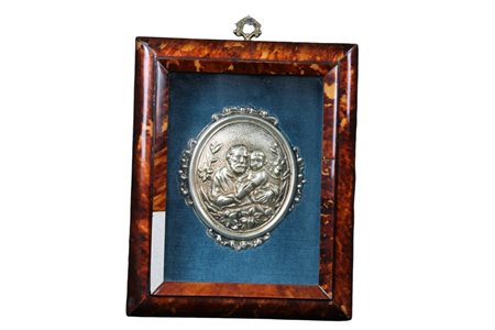 BASSORILIEVO in metallo finemente sbalzato e argentato raffigurante San Giuseppe con Bambino dentro teca in materiale pregiato maestranze siciliane primi XX secolo h cm 11 x 10 / teca 21,5 x 17