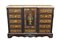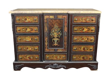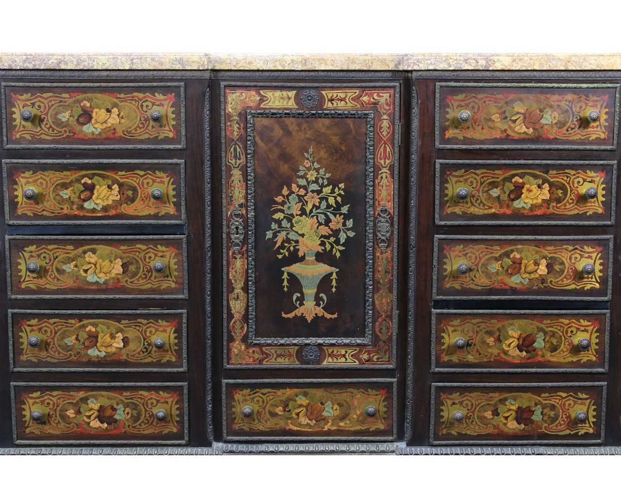CREDENZA in noce riccamente intarsiata , piano in marmo rosa, il fronte presenta ai lati 5 tiretti e anta centrale decorata da cornici bronzei Francia XIX secolo h cm 89 x 126 x 46