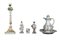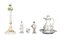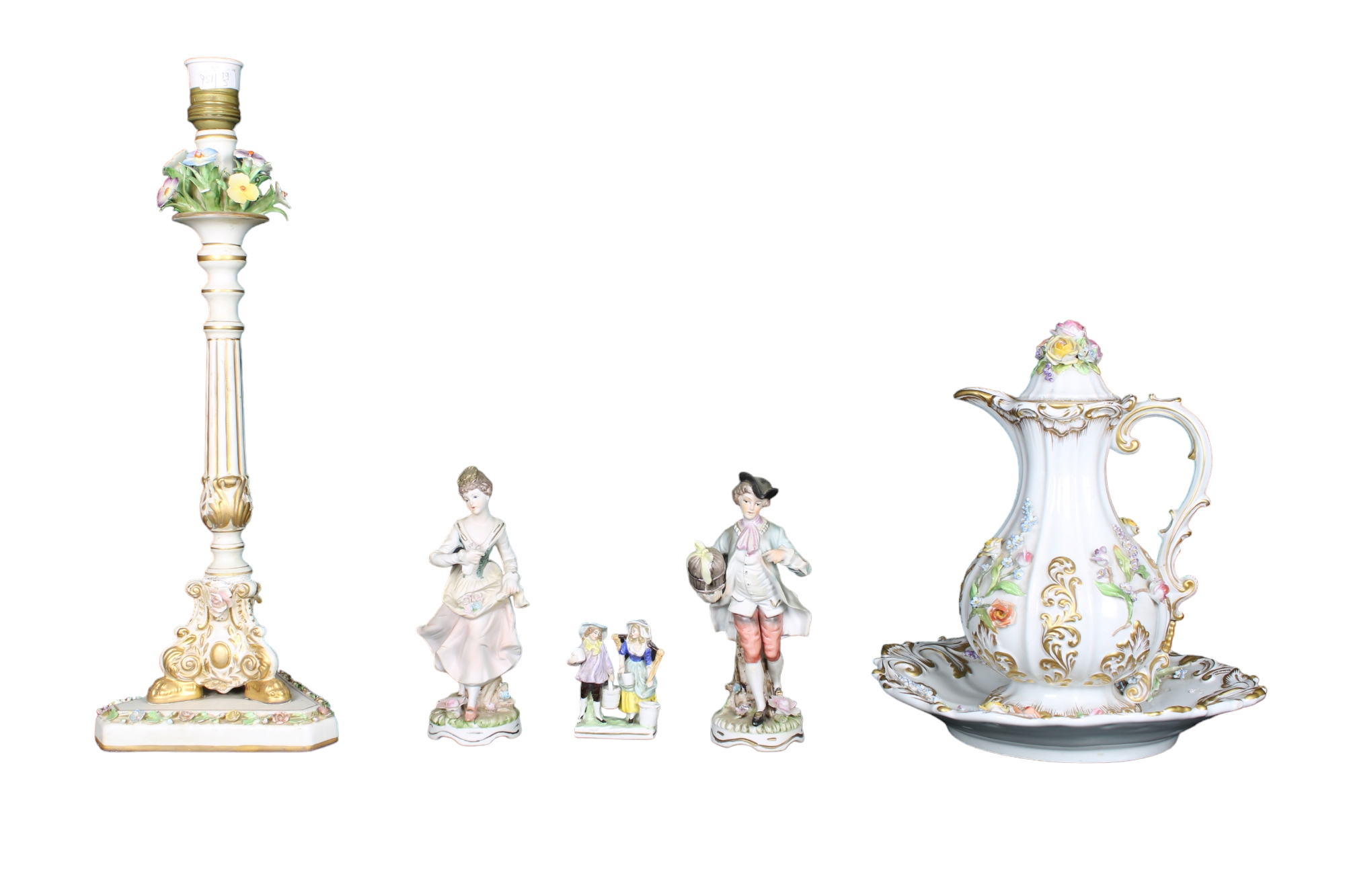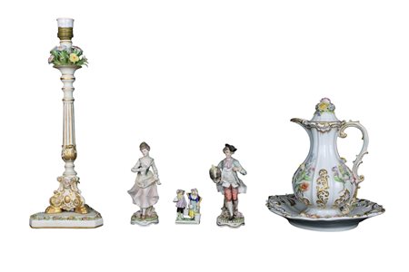 LOTTO COMPOSTO DA UNA BROCCA CON PIATTO, UN CANDELABRO E 3 SCULTURE in porcellana policroma e lumeggiature in oro Capodimonte XX secolo misure varie