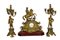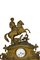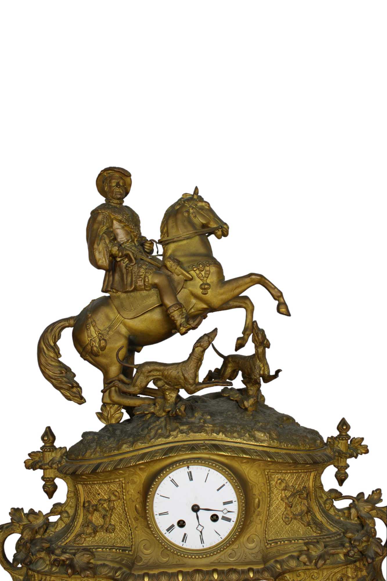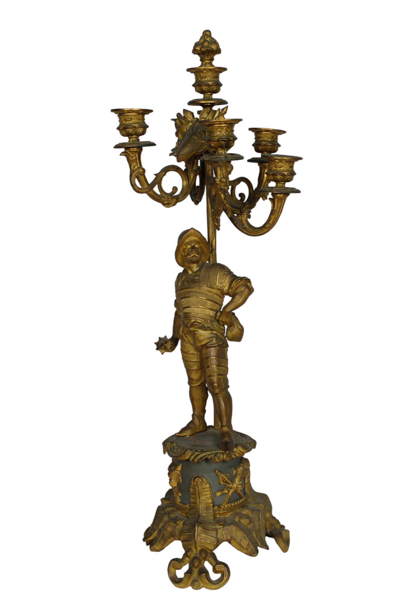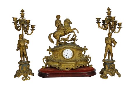 TRITTICO COMPOSTO DA COPPIA CANDELIERI A 6 FIAMME E OROLOGIO raffiguranti cavalieri in antimonio dorato Francia fine II meta XIX secolo cand h cm 69 / orologio h cm 56 x 54
