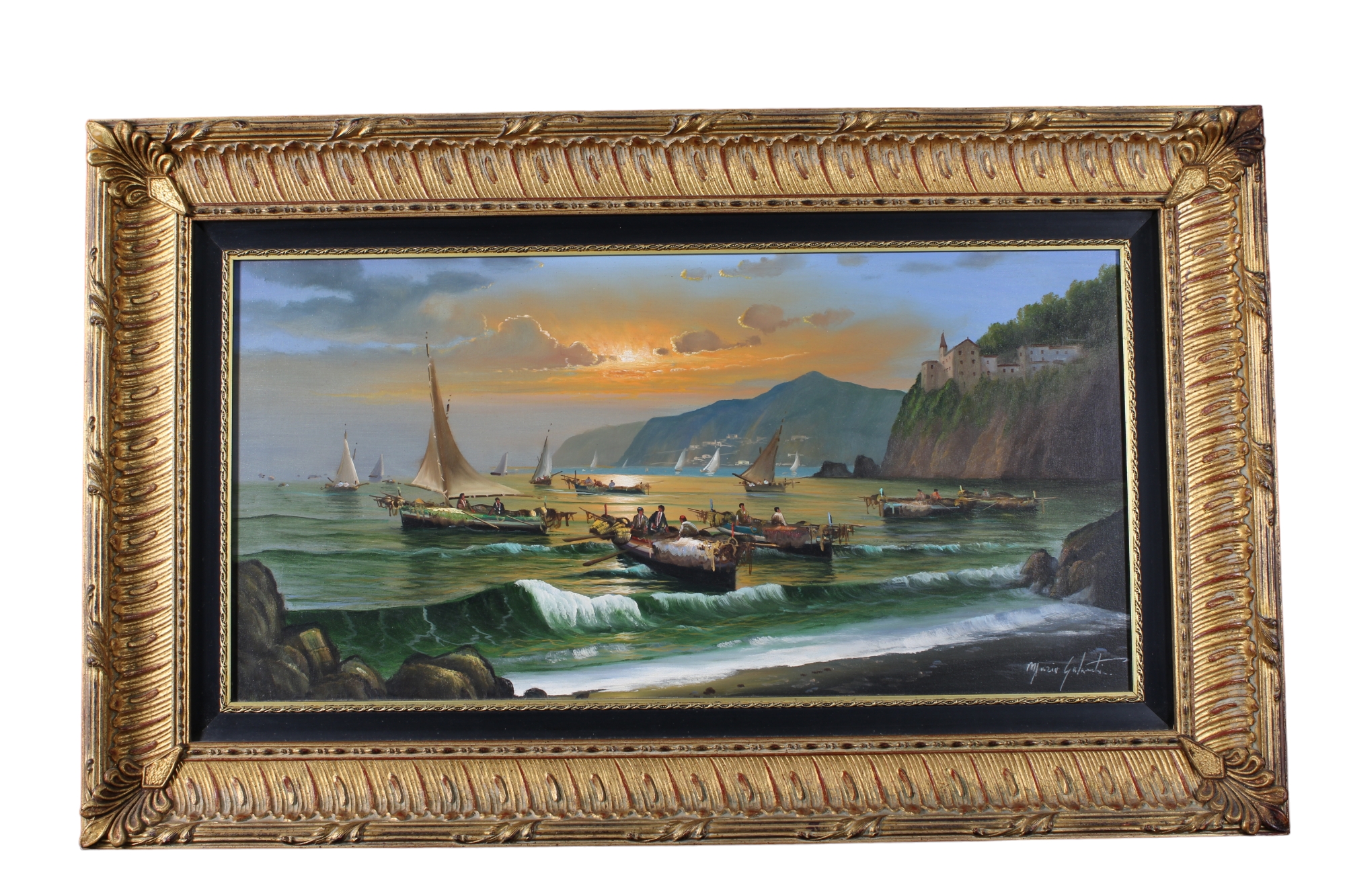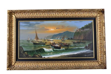 OLIO SU TELA raffigurante Costiera Amalfitana con barche e pescatori firmato in basso a d/x dentro cornice in legno e pastiglia dorata scuola italiana XX secolo h cm 40 x 80 / cornice h cm 63,5 x 103,5