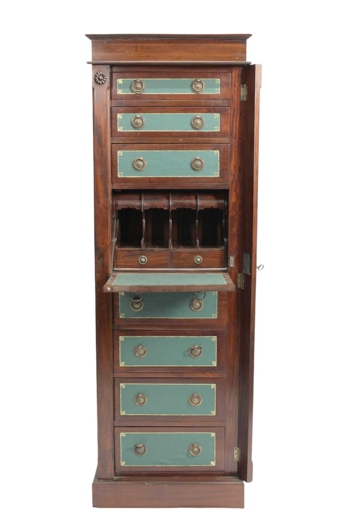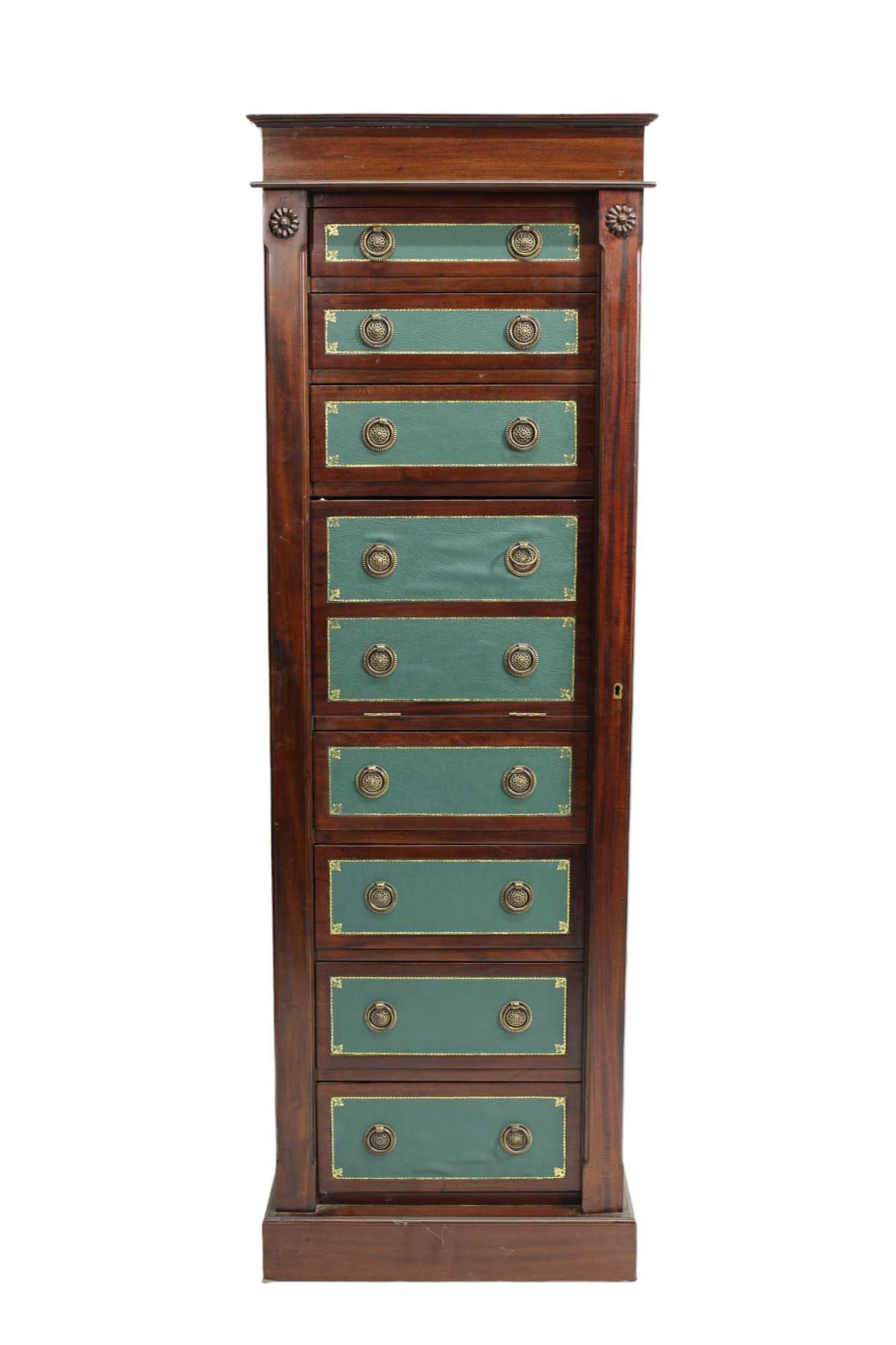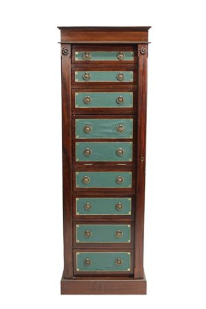 CARTONIERA DA UFFICIO di gusto impero in piuma di mogano con secretaire a scrittoioe applicazioni in pelle e bronzo Francia primi 900 h cm 161 x 54 x 43