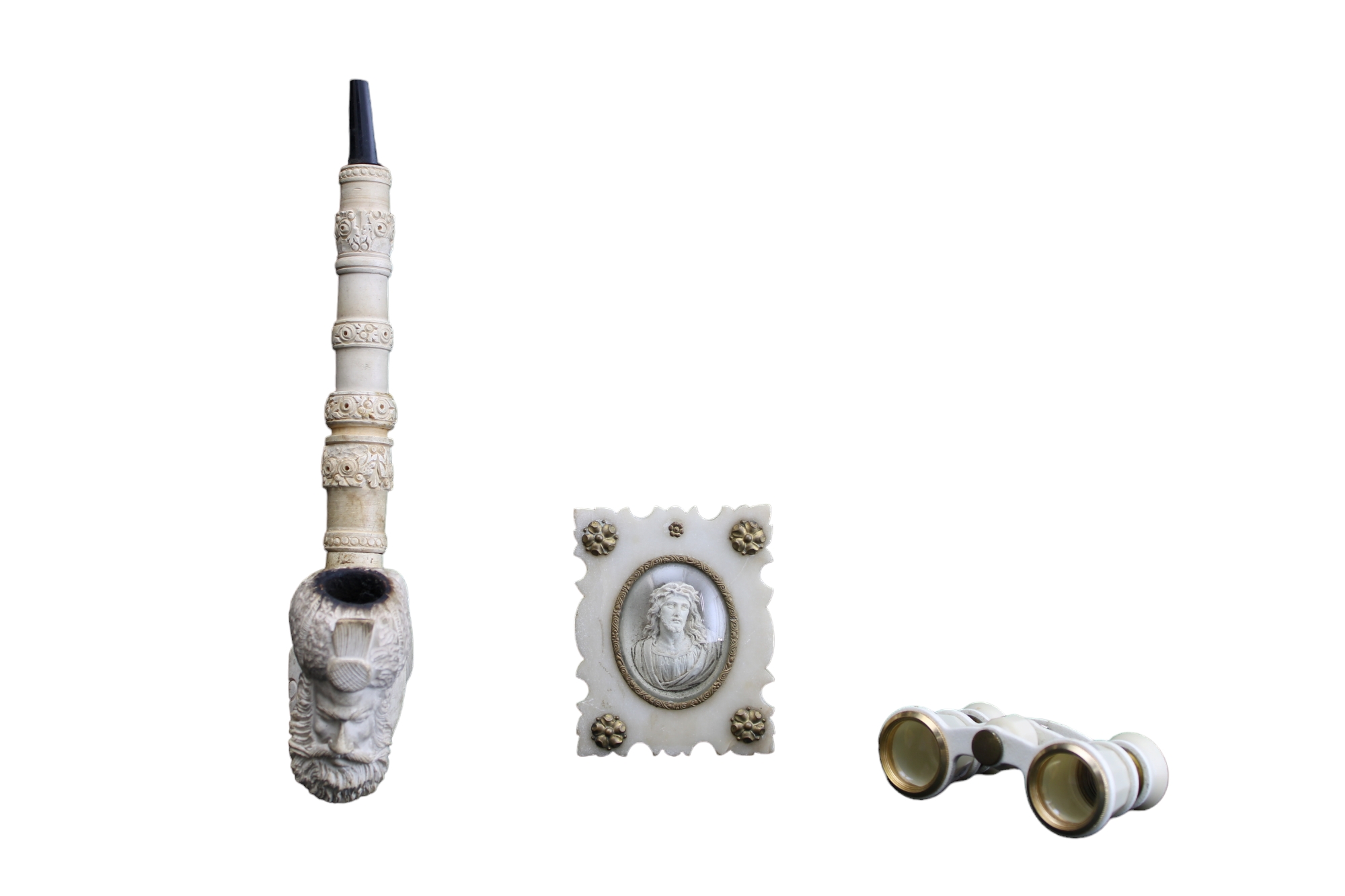 LOTTO COMPOSTO DA UNA PIPA in schiuma, UN BINCOLO DA TEATRO in bakelite e UN BASSORILIEVO in schiuma raffigurante volto di Cristo dentro cornice in alabastro e applicazioni in bronzo dorato Francia fine 800 primi 900 misure varie
