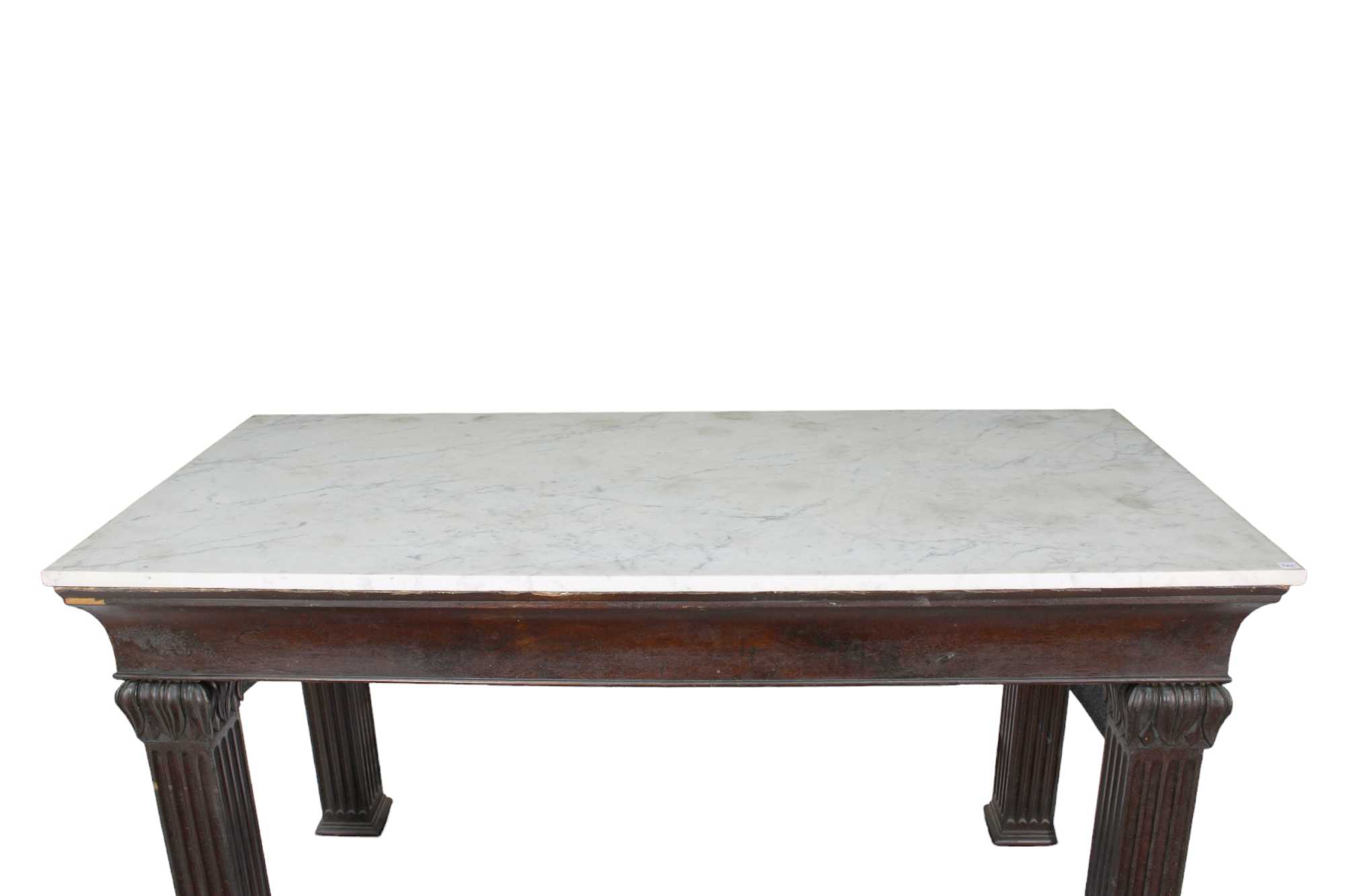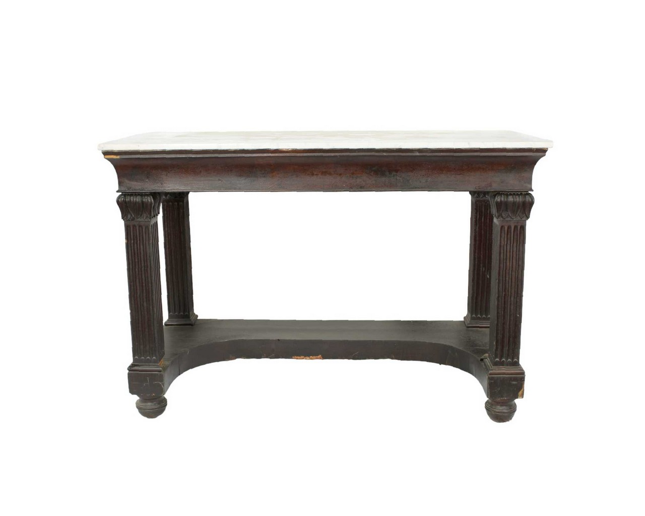 GRANDE CONSOLLE IMPERO in piuma di mogano sorretta da colonne quadre scanalate e capitelli scolpiti, piano in marmo bianco di Carrara Sicilia XIX secolo h cm 102 x 148 x 69