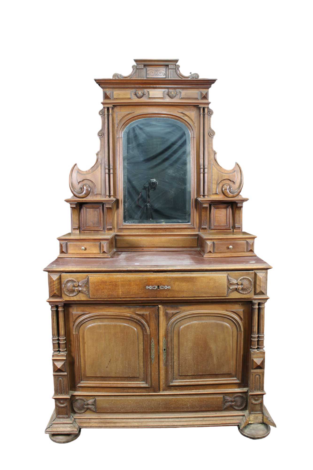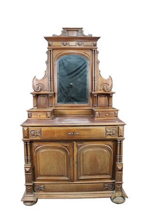 CREDENZA A DUE SPORTELLI con alzata a tolette contenente specchio e due cassettini in legno di noce finemente scolpito Italia XIX secolo h cm 225 x 130 x 58