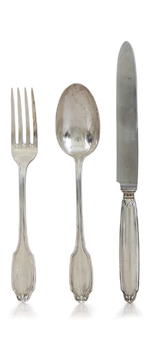 SERVIZIO DI POSATE IN ARGENTO, BOLOGNA, PUNZONI DEL FASCIO, ARGENTIERE CLEMENTI, composto da sei coltelli, forchette e cucchiai, sei coltelli da frutta, dodici cucchiaini da caffè, un mestolo e sei posate da portata