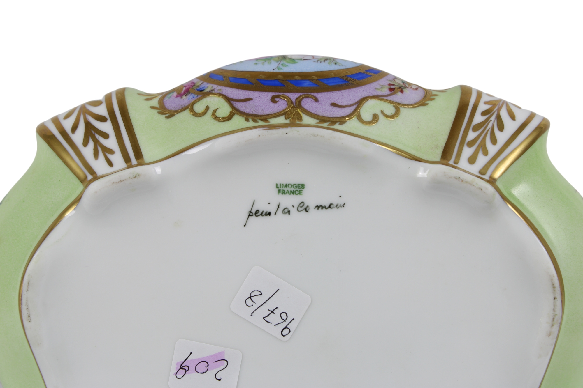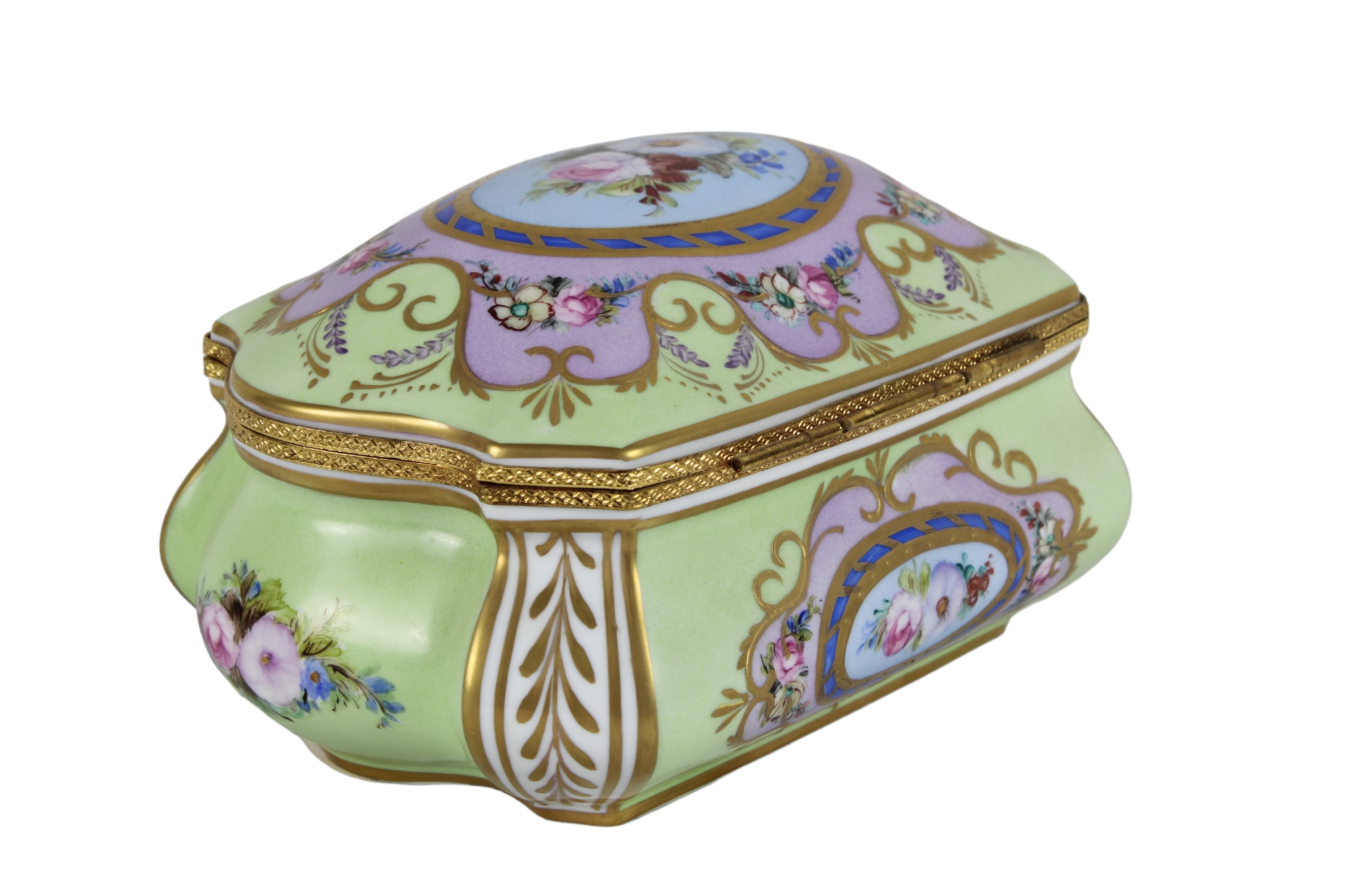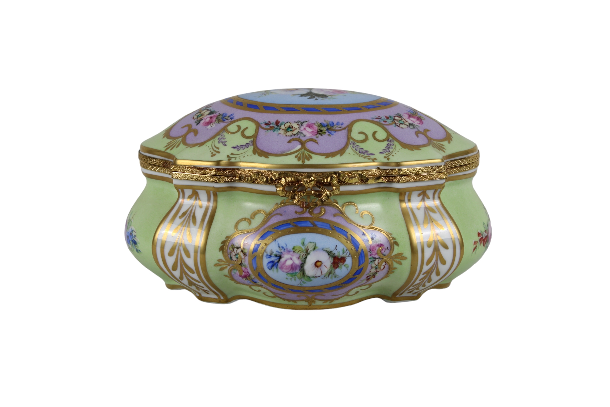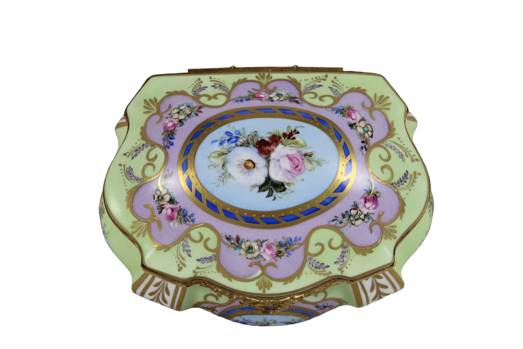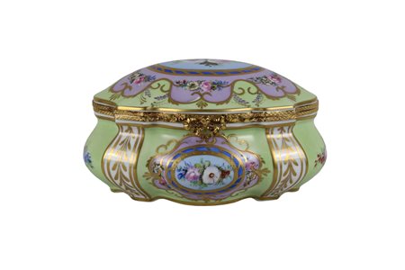SCATOLA in porcellana dipinta a motivi floreali con lumeggiature in oro e applicazioni in bronzo manifattura di Limoges XX secolo h cm 13 x 16 x 20
