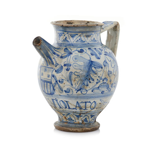 ORCIOLO DA FARMACIA IN MAIOLICA, FAENZA, XVI SECOLO, decoro in blu con foglie, scritta del contenuto e stemma araldico; rotture ricomposte alla base ed interno cementificato.