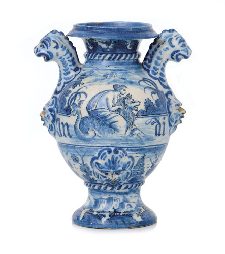 SAVONA IDRIA IN MAIOLICA, SAVONA, XIX SECOLO, biansata, decoro in blu con...
