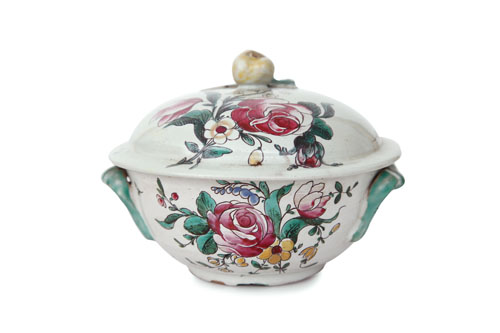 TAZZA DA PUERPERA CON COPERCHIO IN MAIOLICA, SAVONA, G.BOSELLI, XVIII SECOLO, con manici e cimata da frutto, decoro policromo a motivi floreali; firmata "Jaques Boselli"; restauro al coperchio.
