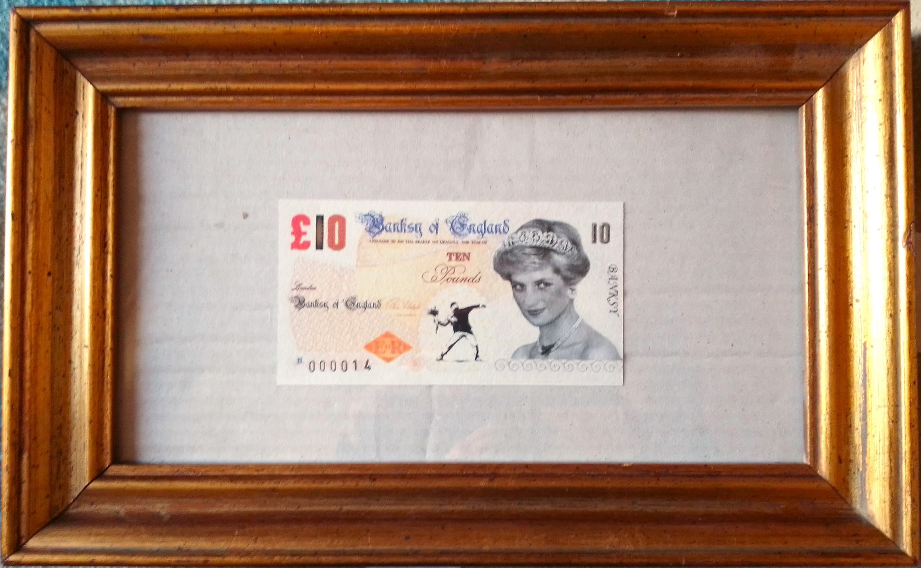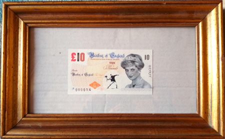 BANSKY ( Bristol 1974) Sterlina Banconota Fluorescente ai Raggi UV Edizione 2023 Solo 5 Serie -Ten Pounds Bansky of Englans- CM 14X7,5M Al Fronte La Frase: I Promise to Pay the Bearer on Demand the Ultimate Price e Timbro Bansky, Immagine della Principessa Diana e il Ragazzo Bendato che lancia un mazzo di Fiori ai Soldati Antisommossa a Madrid, al Retro Re Carlo Incoronato e il Volto di Charles Darwin Certificato Accluso – BANSKY ( Bristol1974) Evento: War in Ukraine Intervento su Banconota Originale Veinte Bolivares CM 16X7 – al Fronte -Ballon Girl and Flag Uktraine- Al Retro Timbri Dismaland in Nero e Bansky