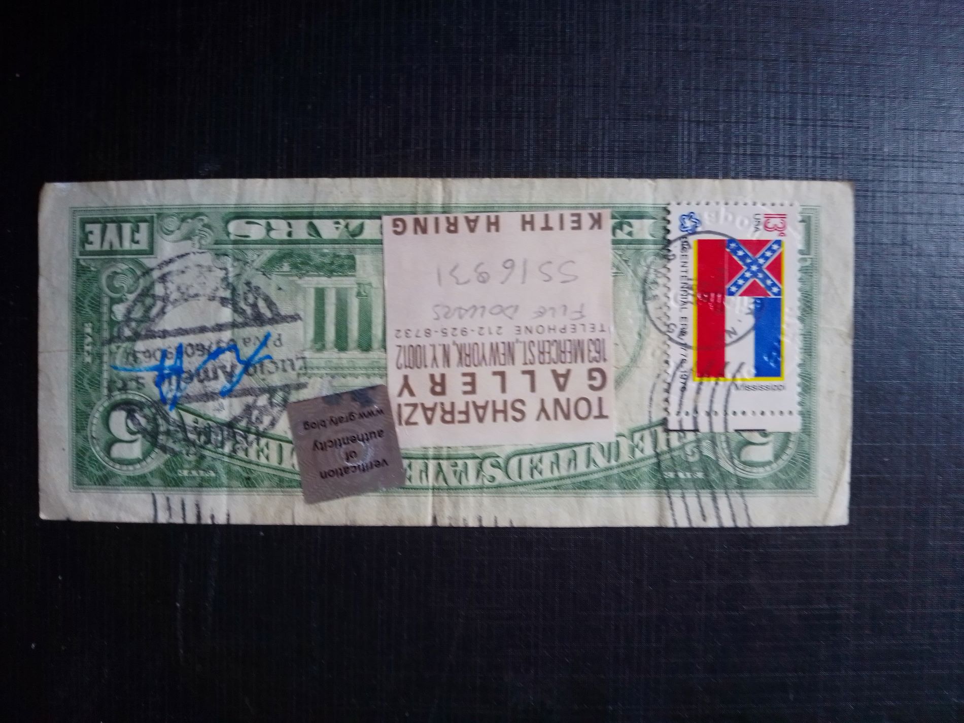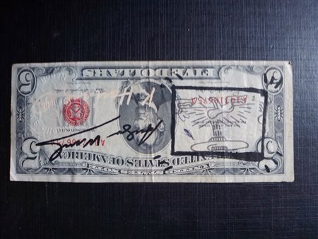 ANDY WARHOL (1928-1987)- Keith Haring (1958-1990) (RARO) 5 Dollari Presidente Lincoln, Intervento su Banconota con Disegno di Haring, Firme al Fronte Warhol-Haring, al Retro Francobollo Usa Missisipi, N. Serie Gallery Tony Shafrazi Keith Haring, Certificato Accluso Inserito in Busta Mail