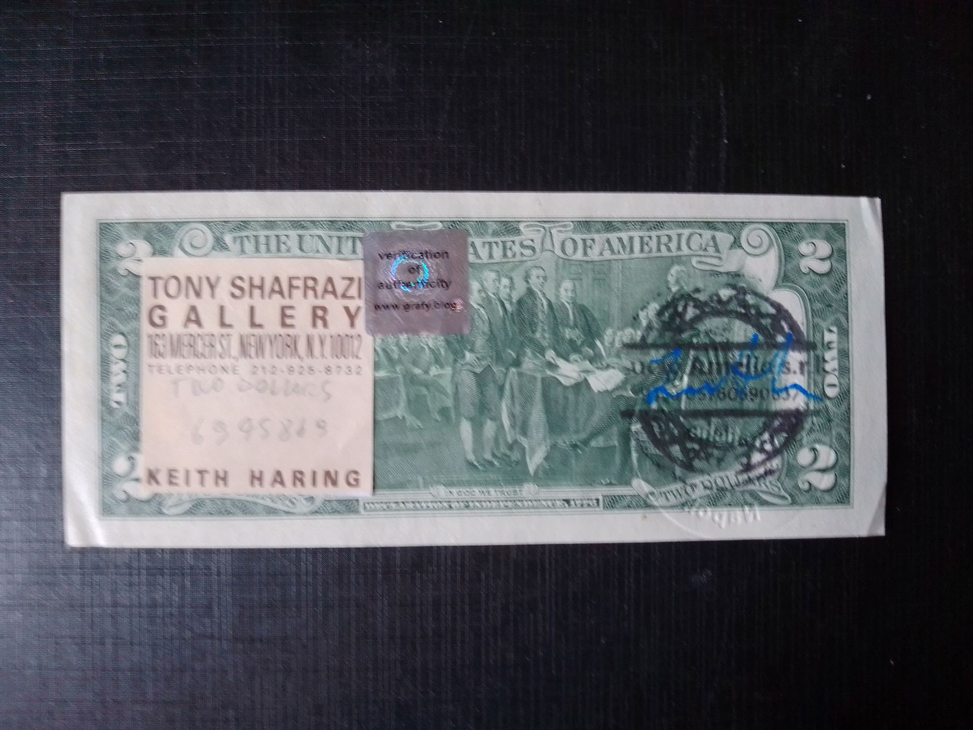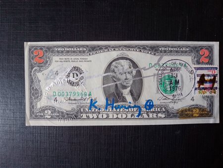 ANDY WARHOL (1928-1987)- K. Harimg (1958-1990) 2 Dollari Presidente Jefferson Intevento su Banconota, al Fronte Firme Warhol-Haring, Francobollo Usa e Timbro 13.04.1976, al Retro N. Serie Gallery Tony Shafrazi K.H. E Certificato Accluso in Busta Mail.