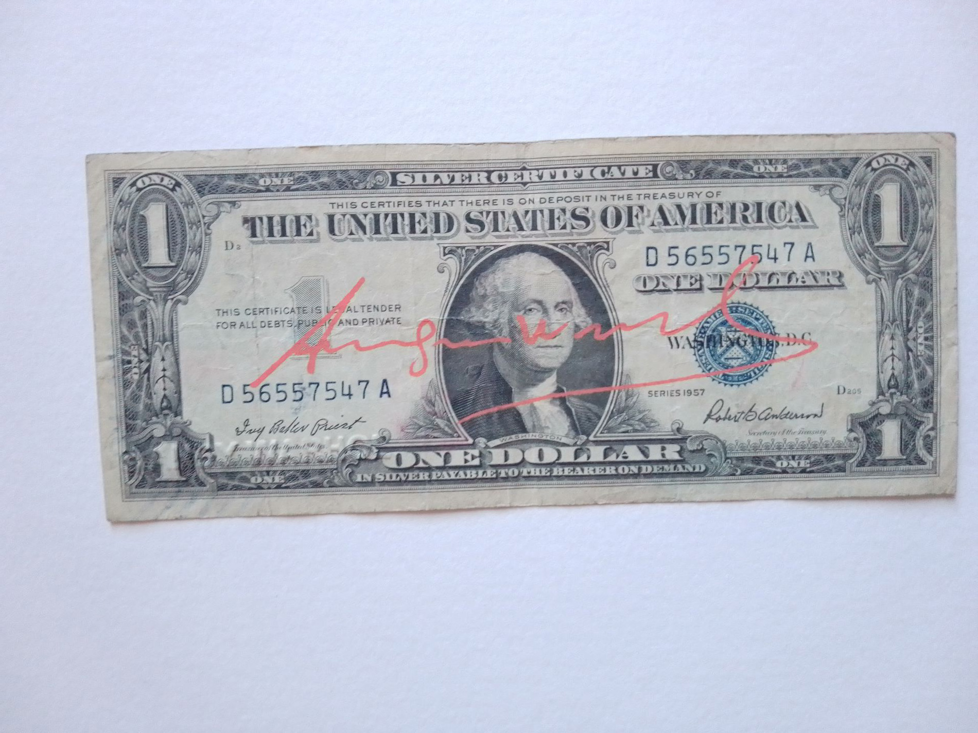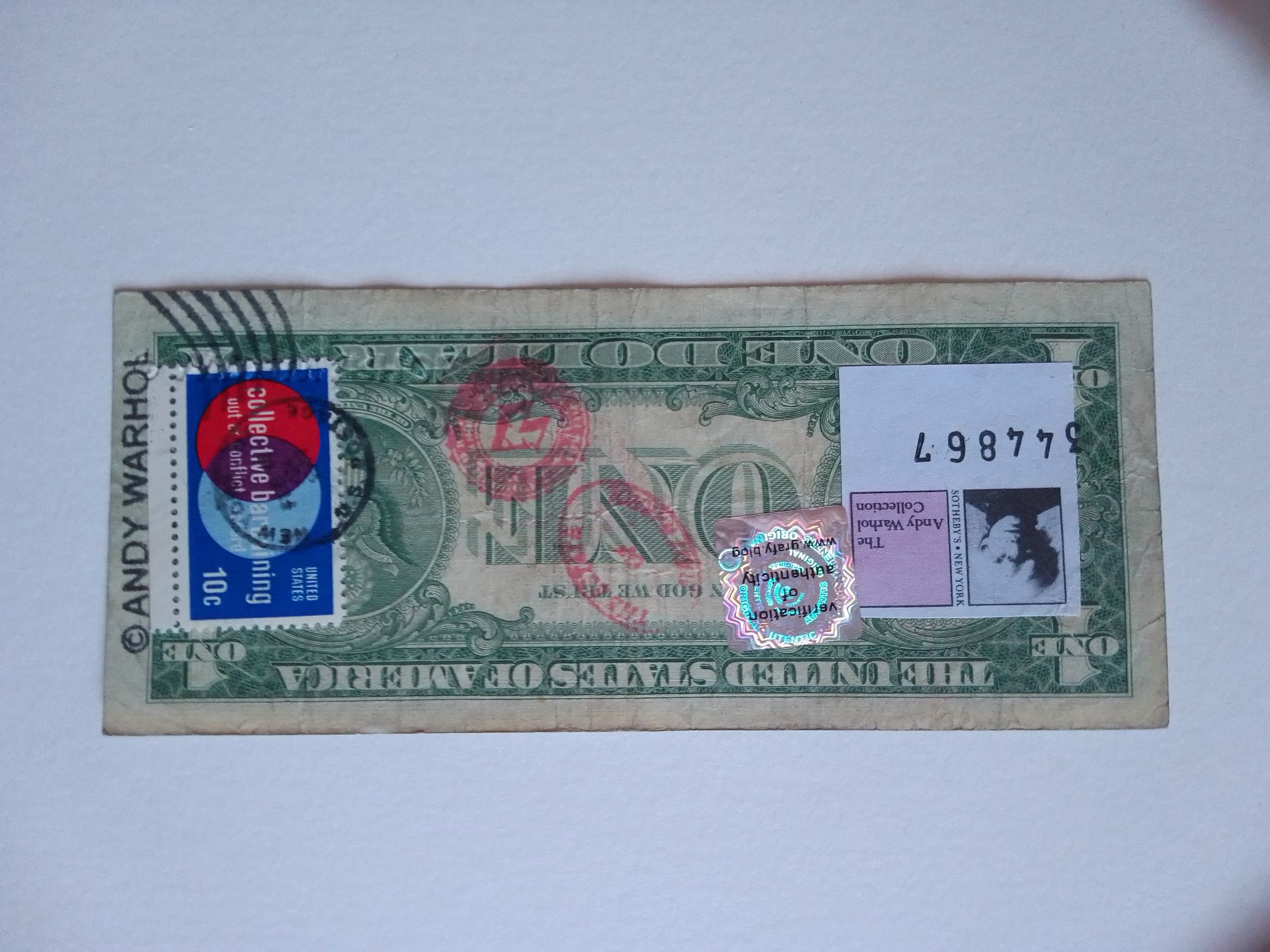 ANDY WARHOL (1928-1987) 1 Dollaro Presidente Washington Intervento su Banconota , Firma al Fronte con Pennarello, al Retro N. Serie e Timbro Fondazione Warhol, Francobollo United States 10 Centesimi e Bollo Poste United States 1977 Certificato Accluso