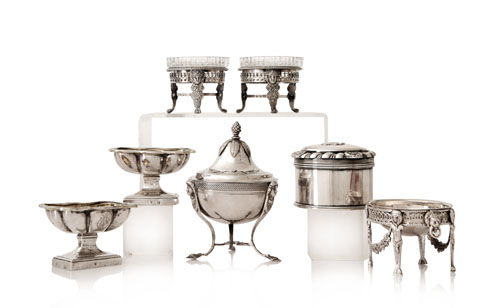 COPPIA DI SALIERE IN ARGENTO, NAPOLI, 1850 CA, AREGENTIERE M.FLORIO, a coppa baccellata con interno vermeil; UNA SCATOLA CON COPERCHIO IN ARGENTO, TORINO, 1820 CA, ARGENTIERE C.BALBINO, bordo baccellato alternato a conchiglie; UNA COPPIA DI SALIERE IN CRISTALLO E ARGENTO, UNA SALIERA E UNA ZUCCHERIERA IN ARGENTO, XIX SECOLO.
