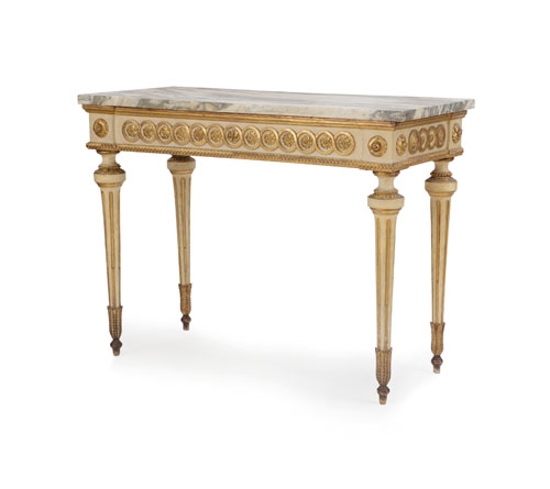 CONSOLE LUIGI XVI IN LEGNO LACCATO E DORATO, FINE XVIII SECOLO, gambe rastremate e scanalate con piedi a foglie d'acanto, fasce con meandri centrato da rosette; piano in marmo di epoca successiva; sbeccature e usure.