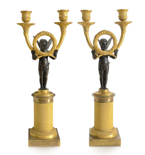 COPPIA DI CANDELABRI IMPERO IN BRONZO DORATO E BRUNITO, PRIMA META' DEL XIX SECOLO, sostegno ad amorino su colonna reggente doppio braccio a cornucopia centrato da corona di fiori,