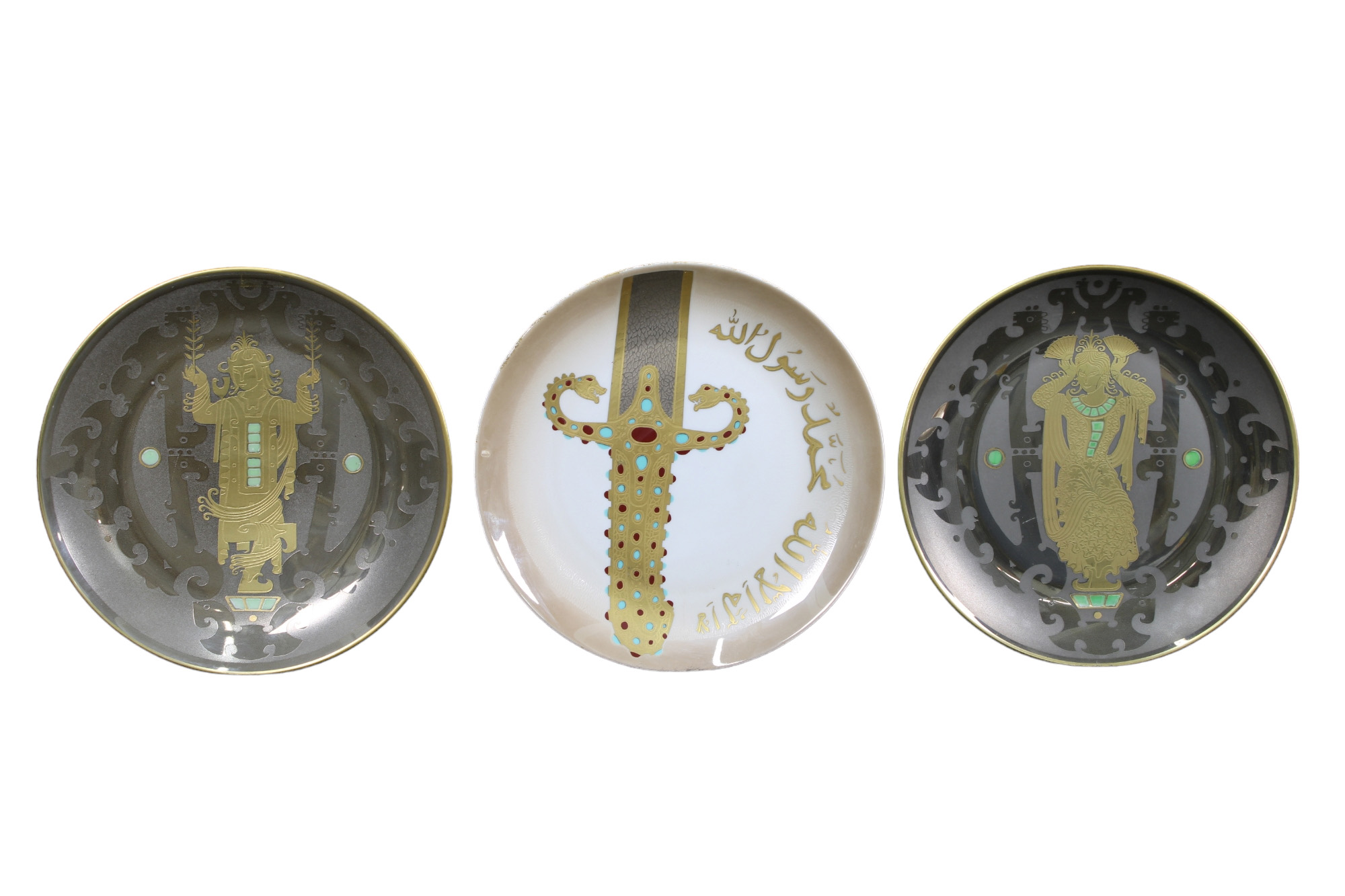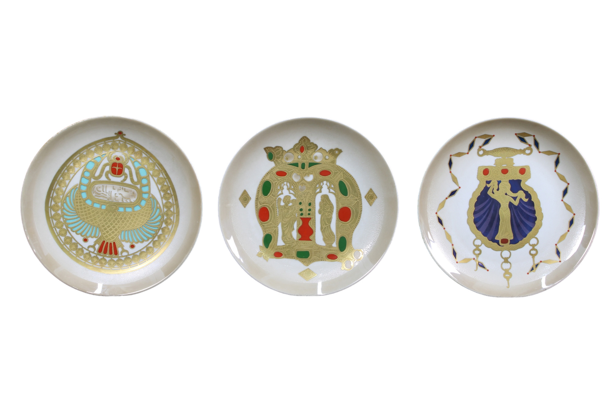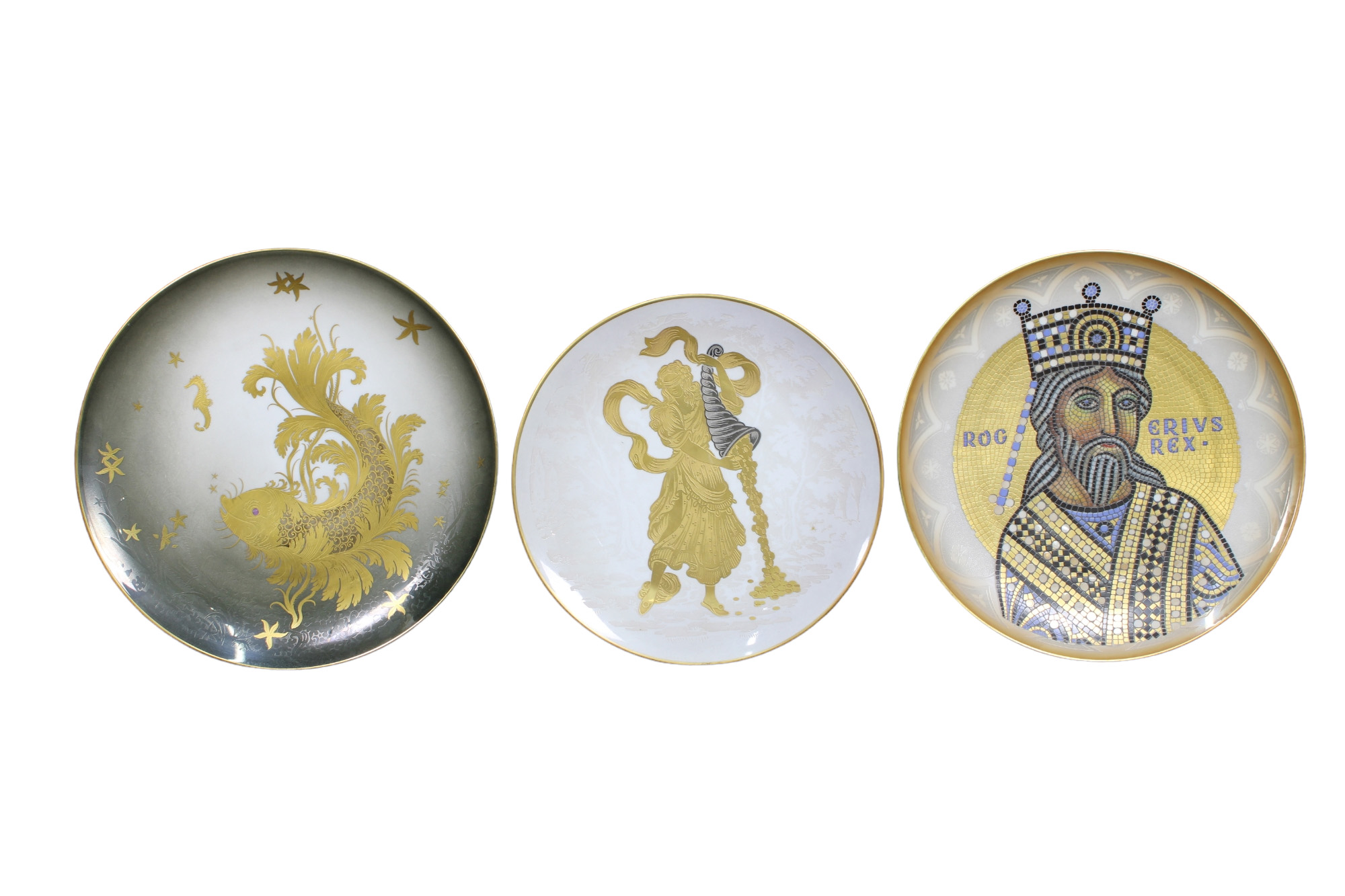 COLLEZIONE DI 9 PIATTI MARBELLI in porcellana incisi e decorati con smalti, oro zecchino e platino Italia XX secolo cm Ø 34 / cm Ø 30 / cm Ø 20