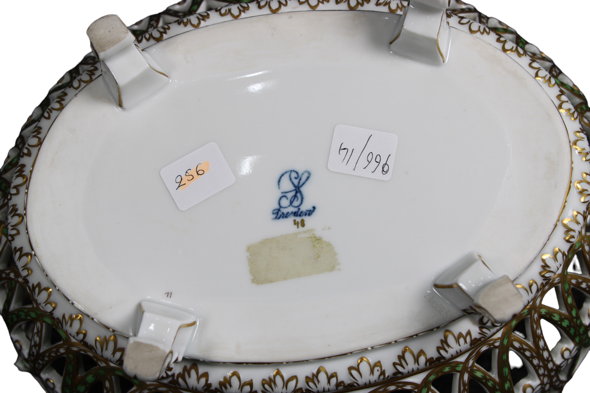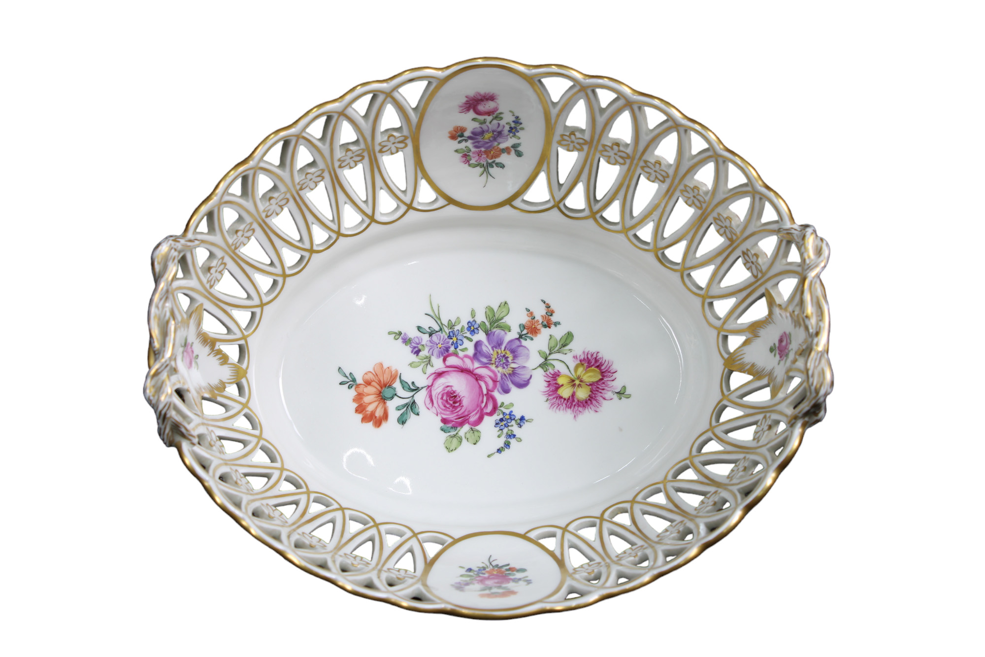 ALZATA in porcellana traforata dipinta e decorata a motivi floreali e dorature marcata Dresden Germania XX secolo h cm 14,5 x 27 x 23