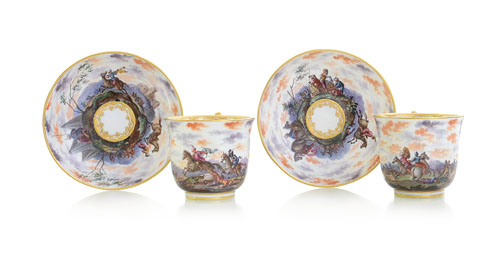 RARA COPPIA DI TAZZE CON PIATTINO IN PORCELLANA, CAPODIMONTE, NAPOLI, 1758 CA., a campana con manico a voluta, decoro policromo a scene di battaglia tra Turchi e Cristiani nei modi di G. Della Torre, bordi "a lambrequin" in oro; marchio giglio azzurro.