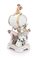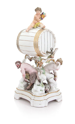 RARO GRUPPO CENTROTAVOLA CON BOTTICELLA PORTA-LIQUORE IN PORCELLANA, NAPOLI, CAPODIMONTE, 1757-1763, MODELLO DI GIUSEPPE RICCI, sostegni a satiro con compagna su base gradinata, cimatura con tappo a putto, decoro policromo e profilature in oro, marchio giglio incusso; qualche traccia di colla a fissaggio della botticella.